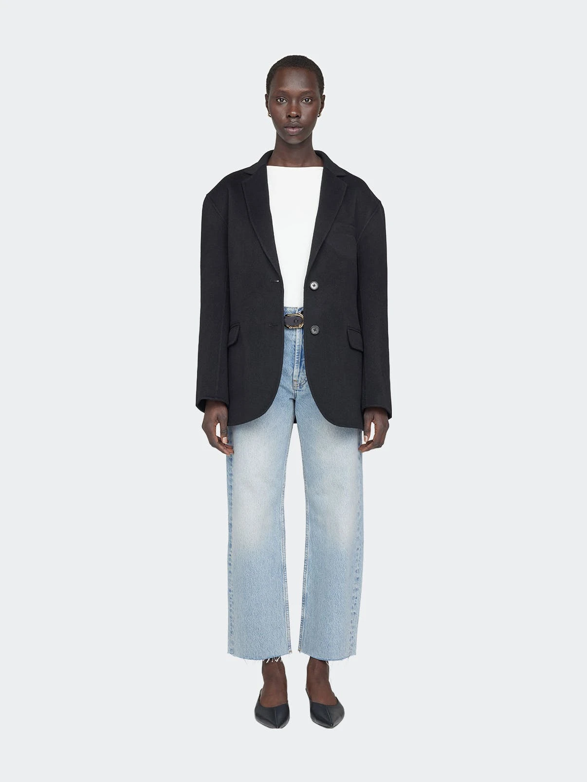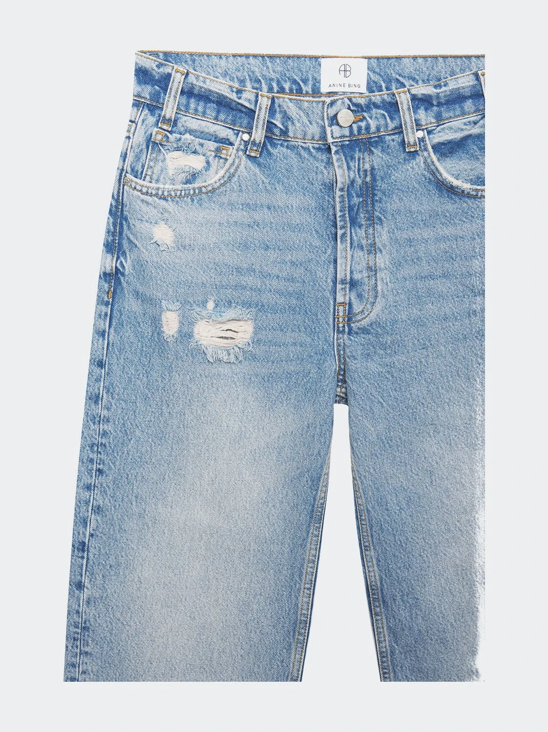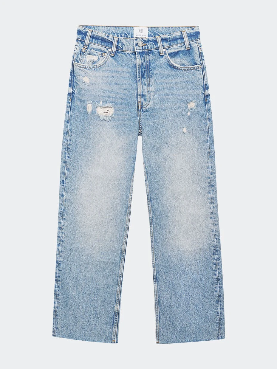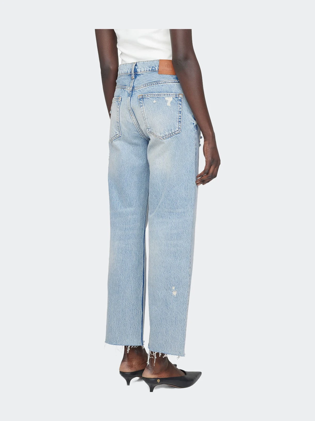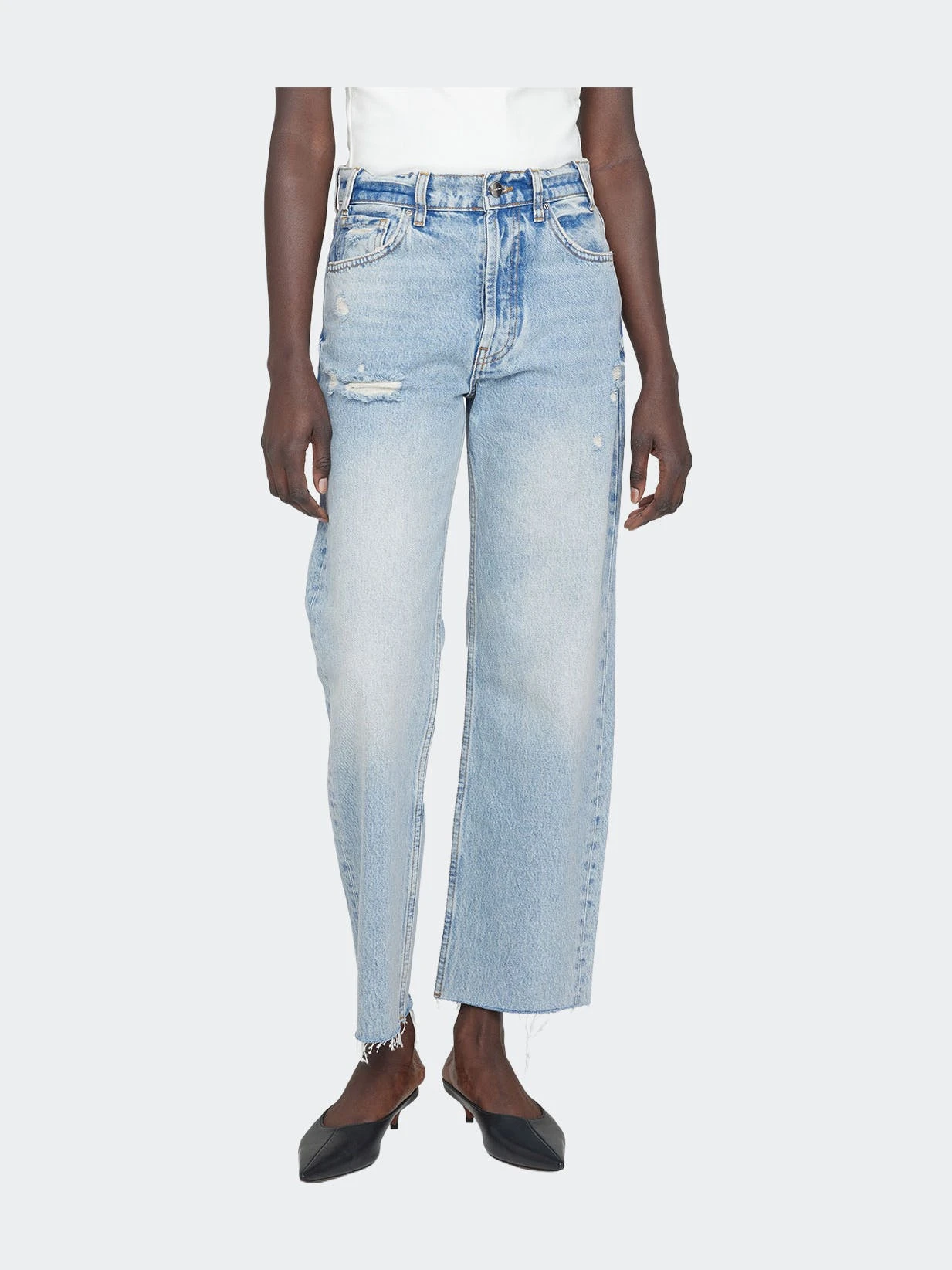 The Gavin Jean is a modern boyfriend-inspired style made from 100% cotton rigid denim in a faded light blue wash with authentic vintage character, including grinding at the back pockets, marbling, and highs and lows throughout. This slightly cropped, straight-leg pair comes finished with a raw-edge hem.