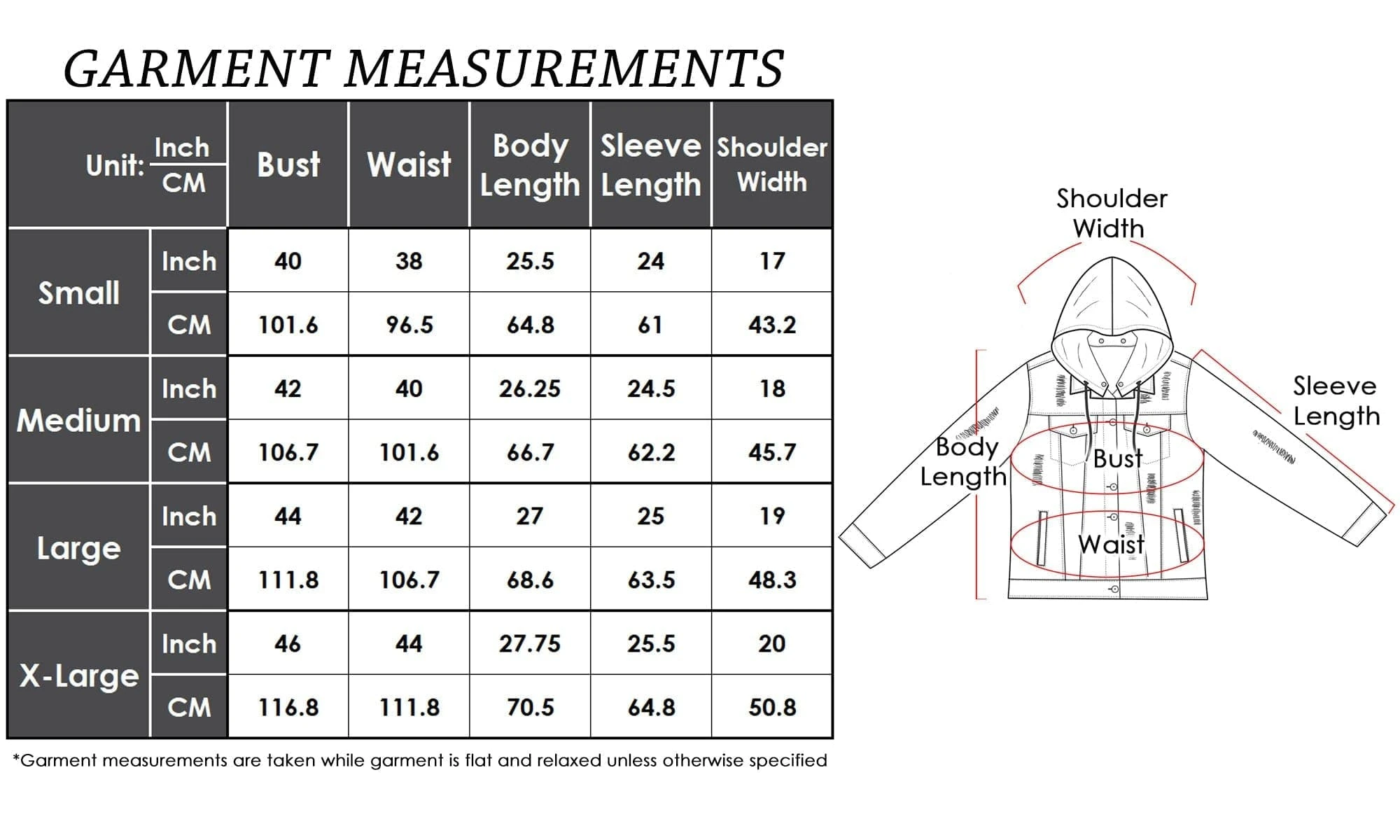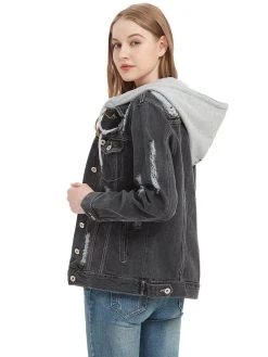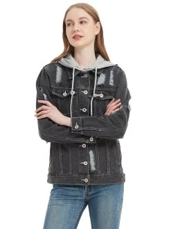 – Casual loose fit, ripped and distressed, button closure, 4 fuctional pockets- Detachable hoodie design, you can remove the grey hood for a classic denim jacket looking- Pairs easily with all styles and ideal for layering; match with shirts, jeans, leggings, sneakers, etc- Refer to the garment measurement chart in the pictures for help when choosing a size