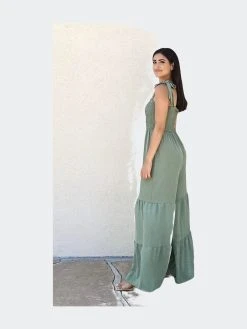 The Anna-Kaci jumpsuit is detailed with unique tiered legs. Features a straight neck line, tie shoulder detail, shirred bodice, wide leg silhouette, and floor length. Pair it with a straw hat and kitten heels for a fantastic look.