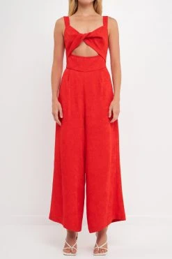 The Anna-Kaci jumpsuit is detailed with unique tiered legs. Features a straight neck line, tie shoulder detail, shirred bodice, wide leg silhouette, and floor length. Pair it with a straw hat and kitten heels for a fantastic look.