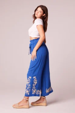 A paperbag waist and embroidery detail washing over the wide legs of the Marta pants create comfort meeting enchantment.