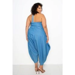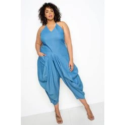 – Halter neck jumpsuit- Front pockets- Voluminous harem pants bottom- Ture to size- Our model is 5’11” · wearing 2x