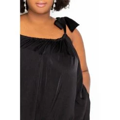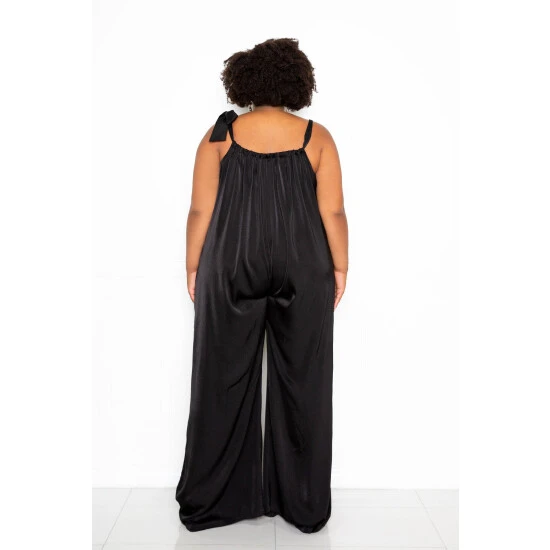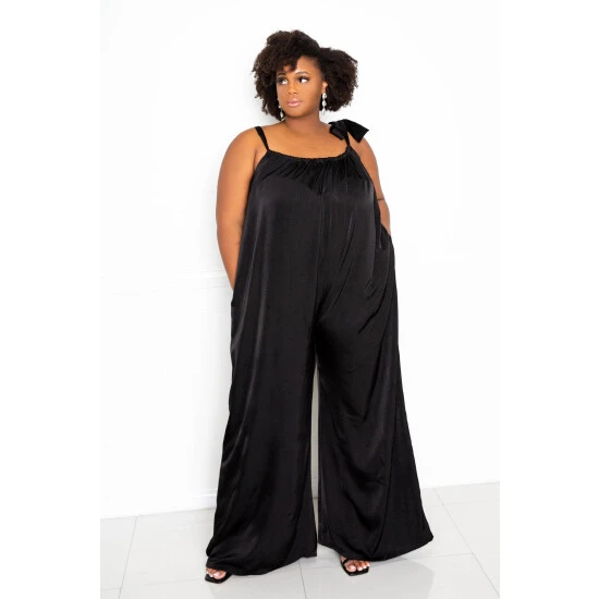 – Black- Square neck- Tie shoulder strap- Side seam pockets- Palazzo bottom- 97% polyester, 3% spandex- Hand wash- Imported- True to size- 1x=14-16, 2x=18-20, 3x=22-24- Our model is 5’8″ · – Wearing 2x