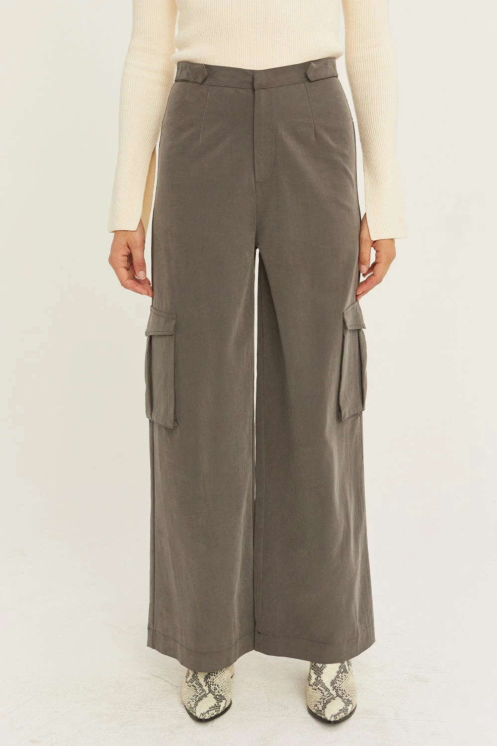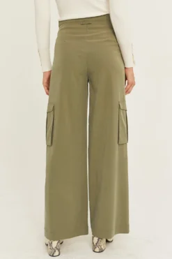 These pants feature waist flap detail with button and utility pockets in a wide leg silhouette. Made with lightweight, buttery tencel-lycra blend.