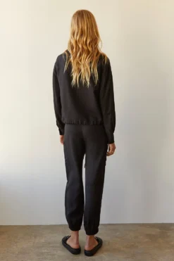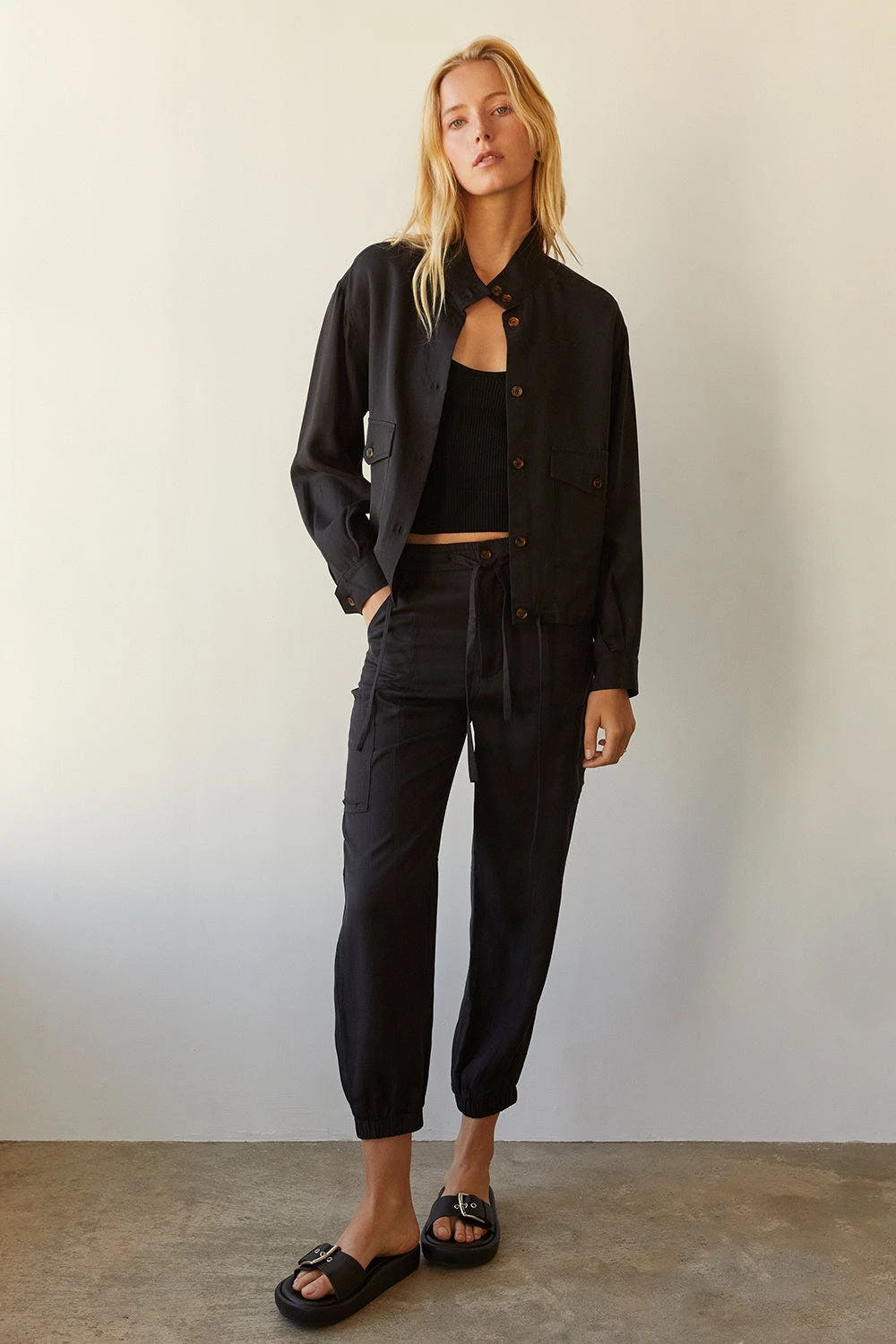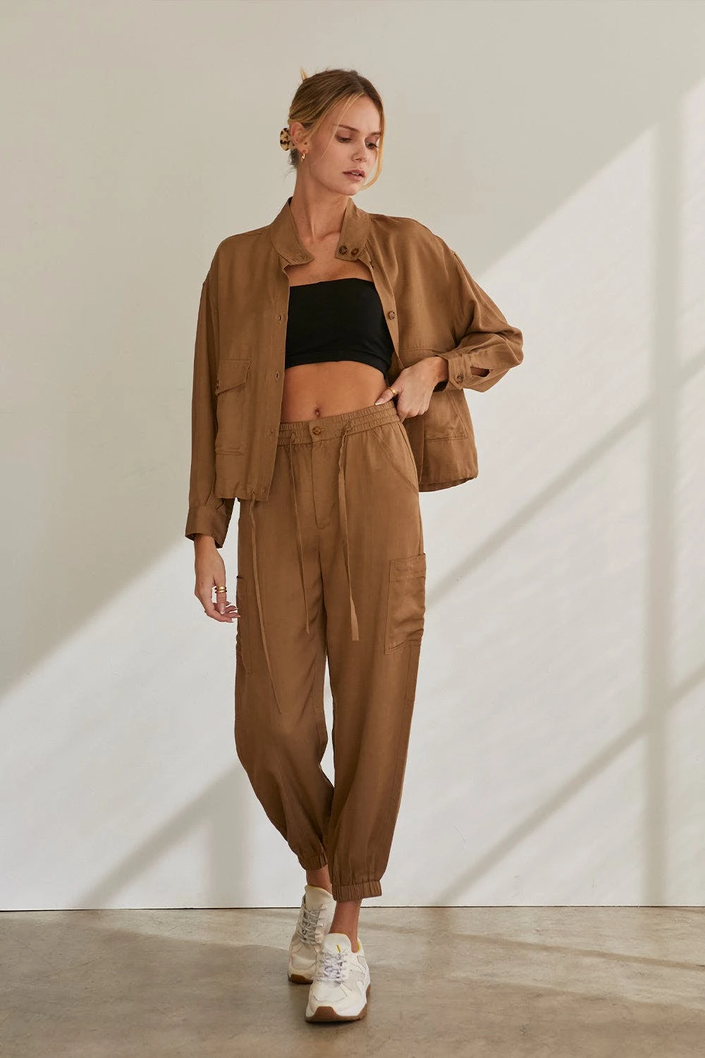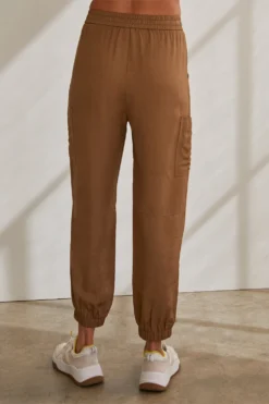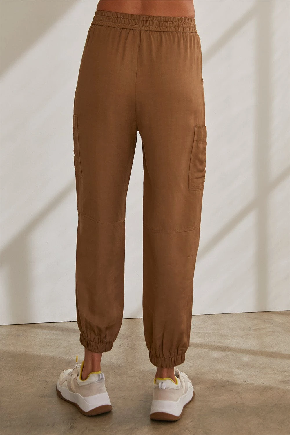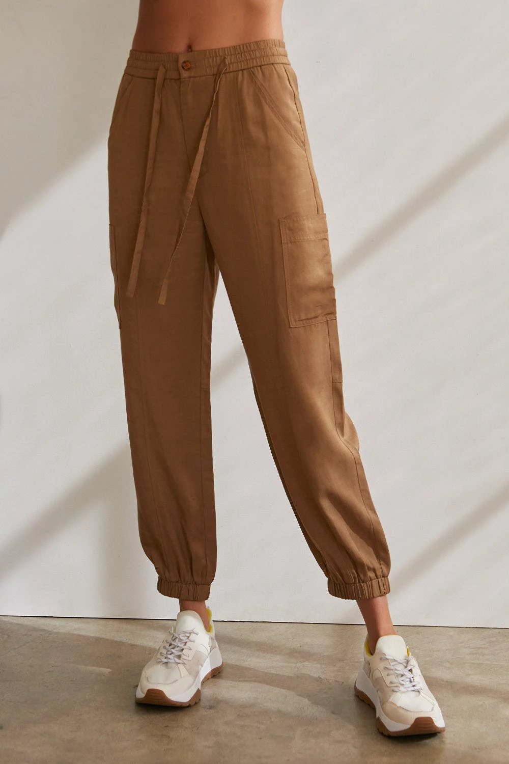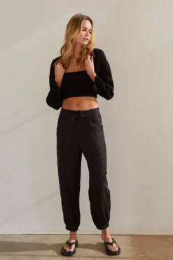 – Button and zipper front closure- Elasticized waistband with string fastening- Front and side patch pockets- Elastic bottom hem