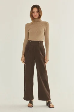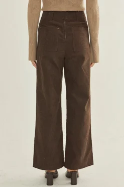 Taylor Corduroy Pants are high-rise, wide leg pants with side and rear patch pockets. Feature thick belt loops with button closure, contrast thread tacking detail on pocket opening and back zip closure.