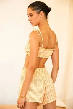 The Pacific Isle shorts feature a high rise fit and a ruffle trim at the waist.