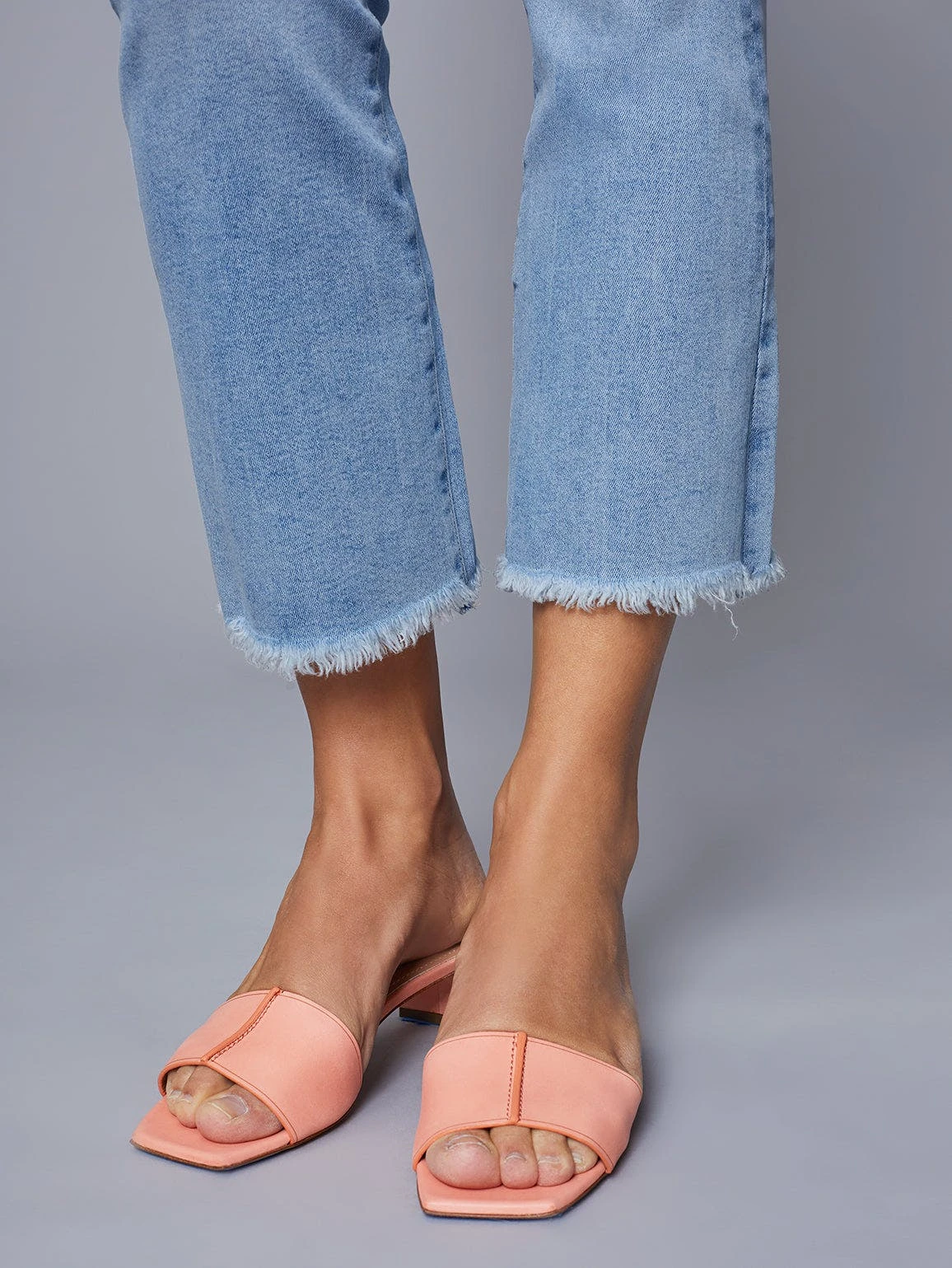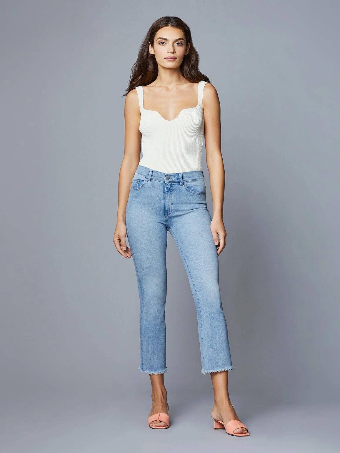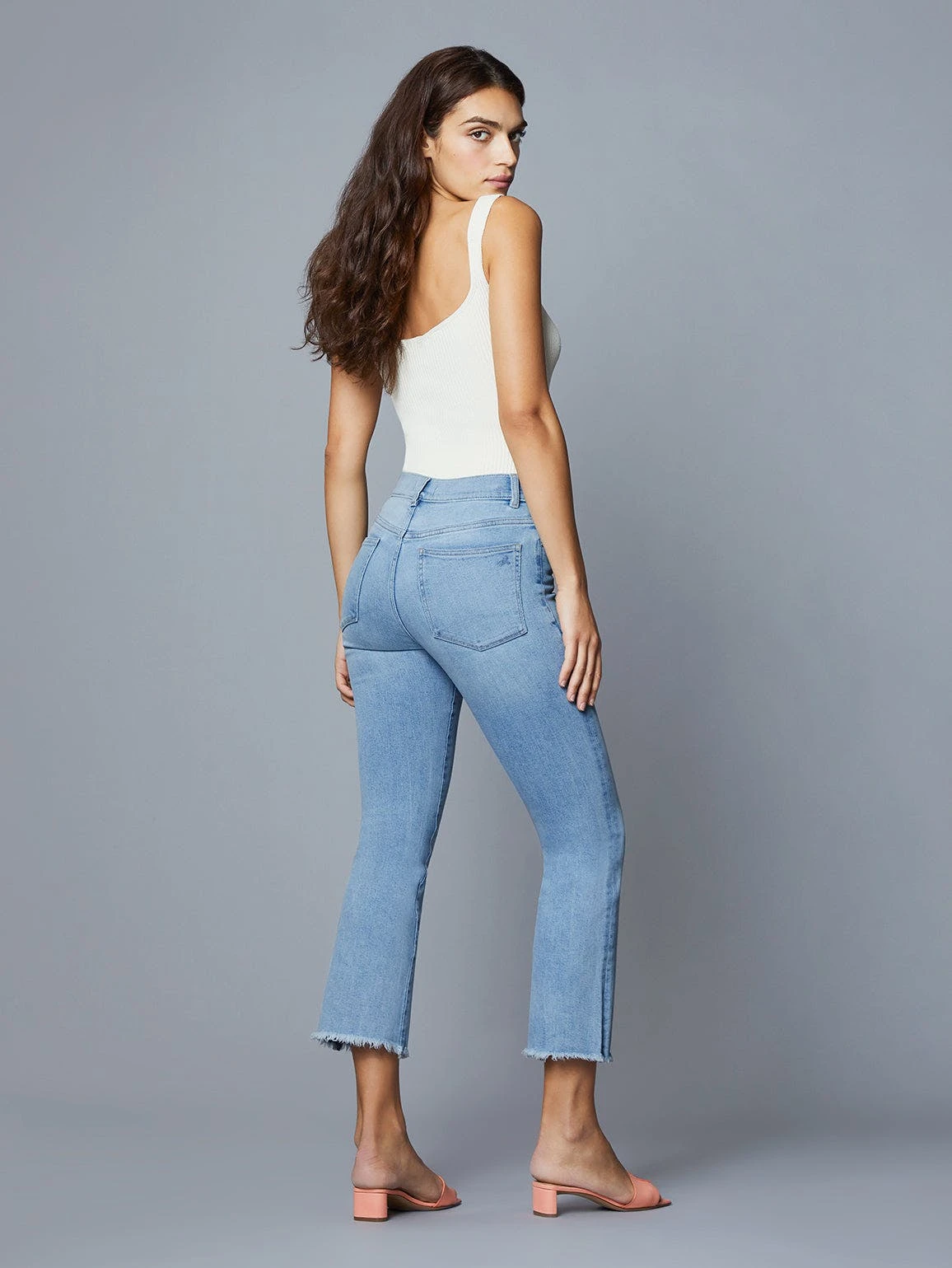 Bridget is a high-rise, cropped boot cut fit that utilizes our instasculpt technology to smooth, sculpt, and conform to your body for the perfect fit.Baby blue is a light indigo wash with khaki stitching, matte silver hardware and a raw, frayed hem.