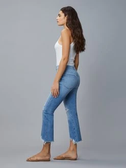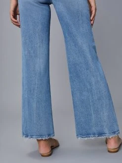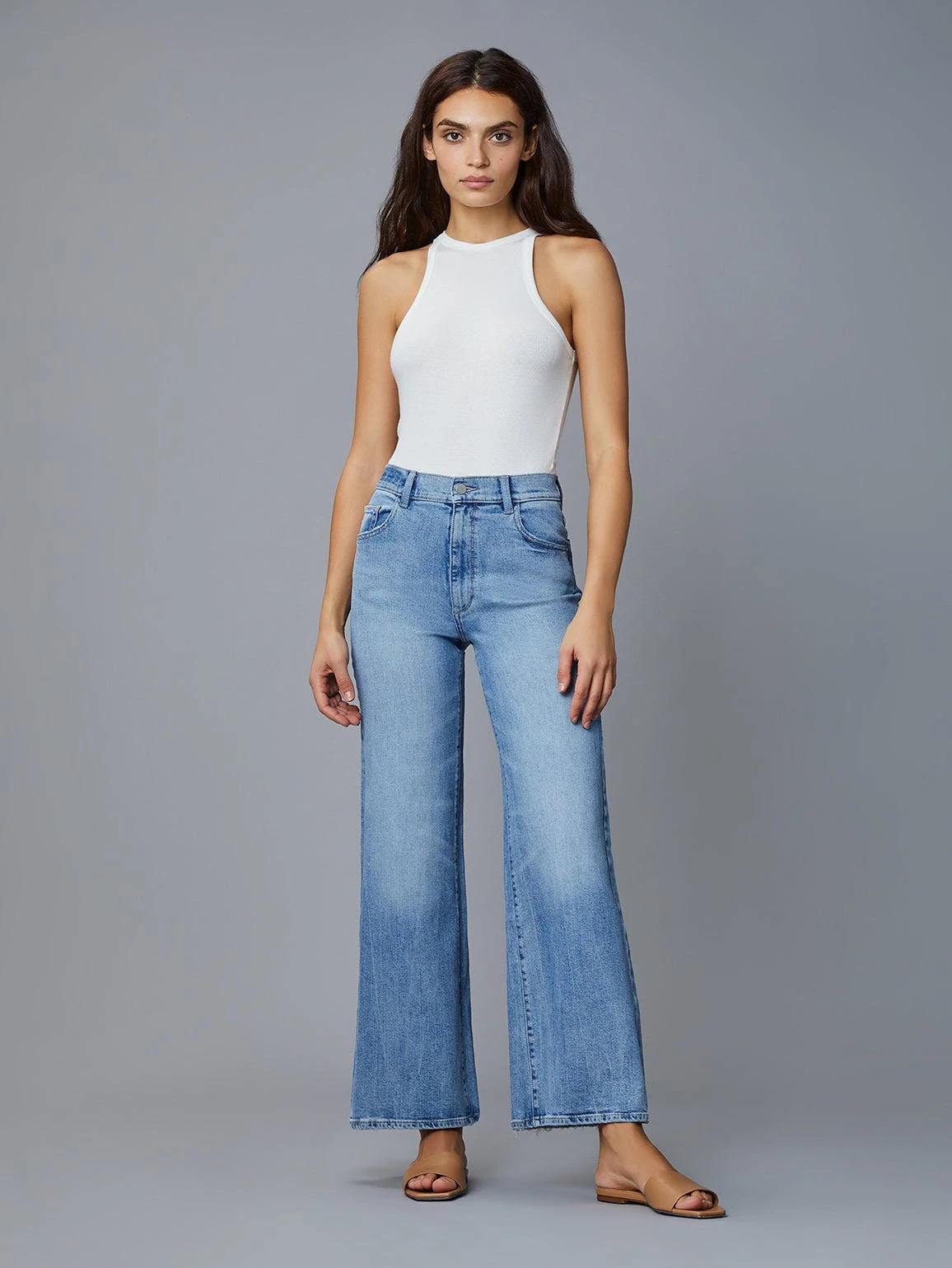 Hepburn is a vintage high-rise that is fitted through the waist and seat, tapering outward from the thigh for a wide leg with a 31″ inseam.Droplet is a mid-to-light indigo with fading throughout, grinding at the pocket edges and back of the clean hem. It features light khaki stitching and matte silver hardware.