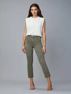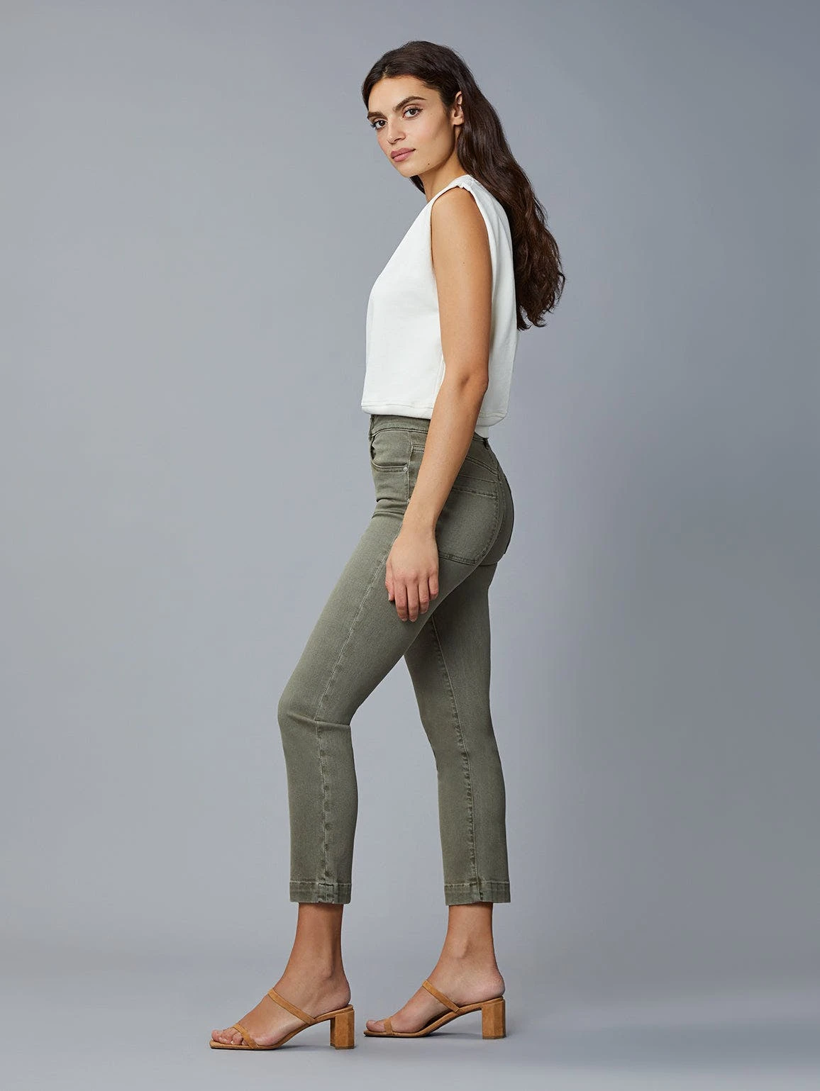 Patti is a high-rise, vintage straight fit with a 27″ inseam that is relaxed through the leg for the classic look you love combined with modern comfort.Army is a pigment- dyed soft olive with utility inspired back patch pockets. It features tonal stitching, matte silver hardware and a clean hem.