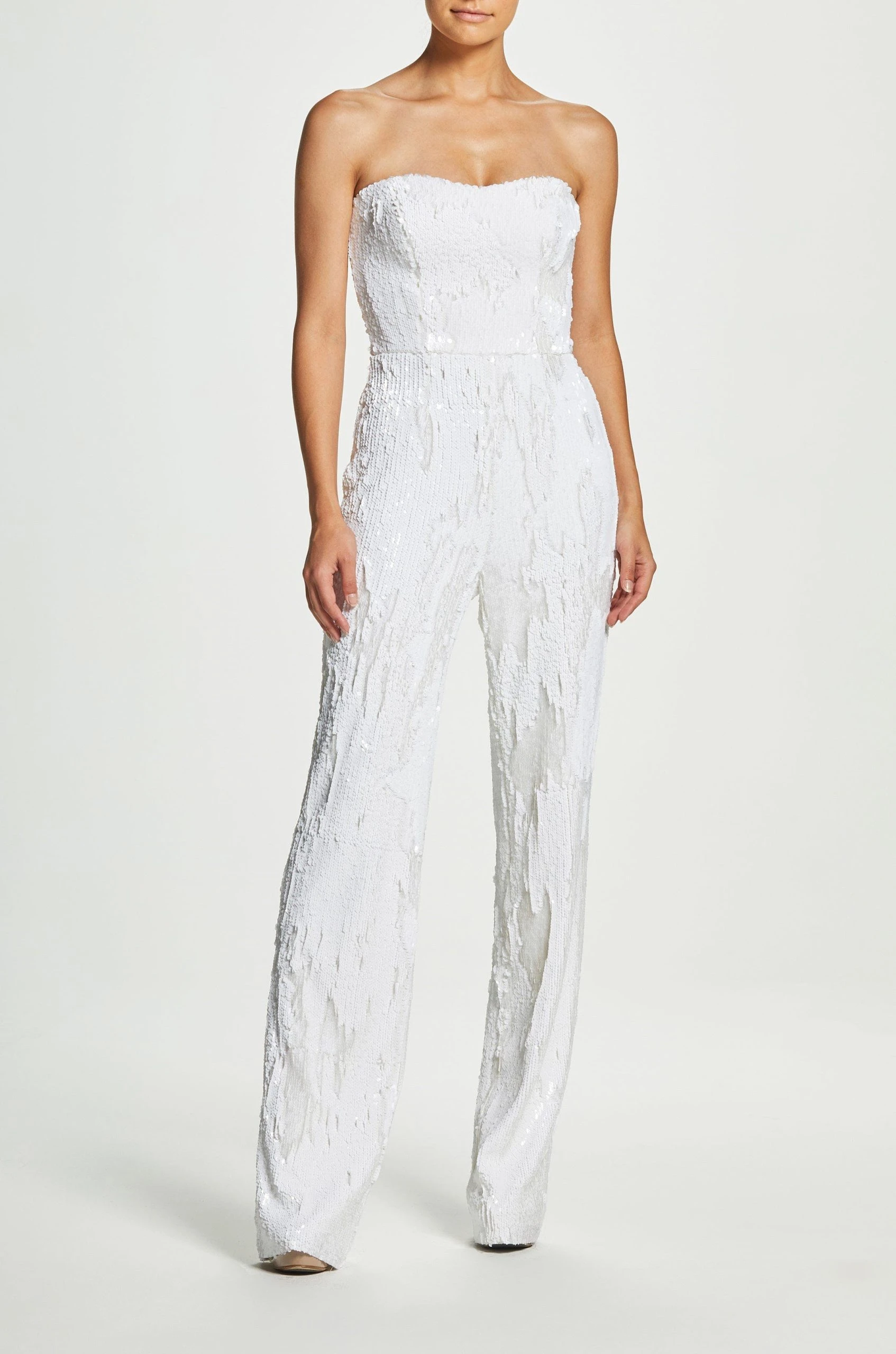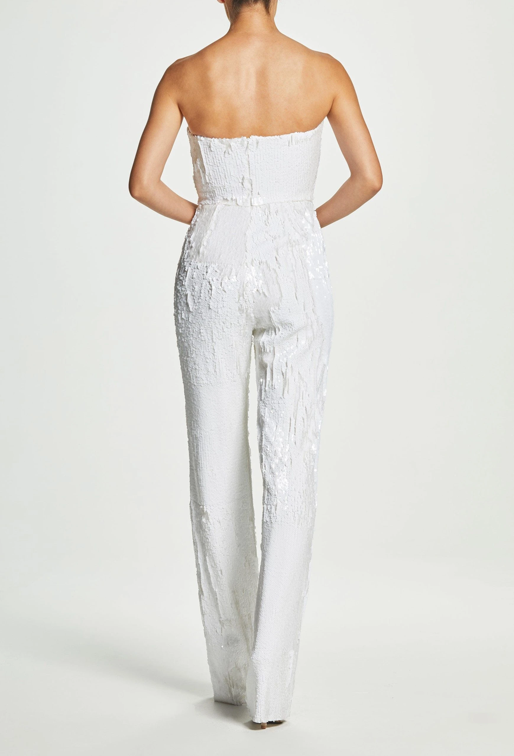 The Andy Jumpsuit in Lily dazzles with two-tone sequins from top to bottom. This glittery ensemble features a strapless semi-sweetheart neckline that shows off the shoulders and decolletage. Floor-length wide-leg pants create a straight silhouette to elongate the body. The white sequins create abstract patterns when pushed and manipulated in different directions with one side shiny and one side matte.