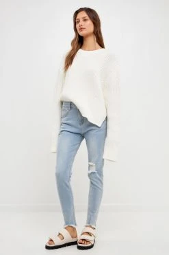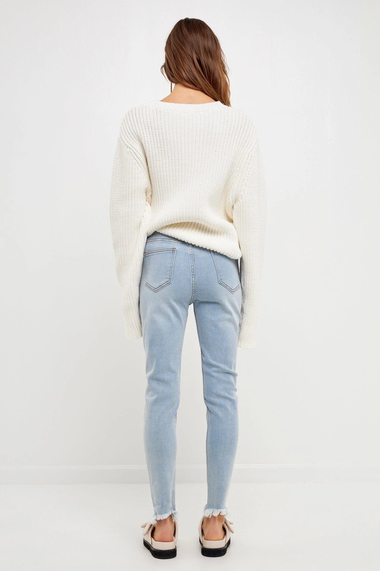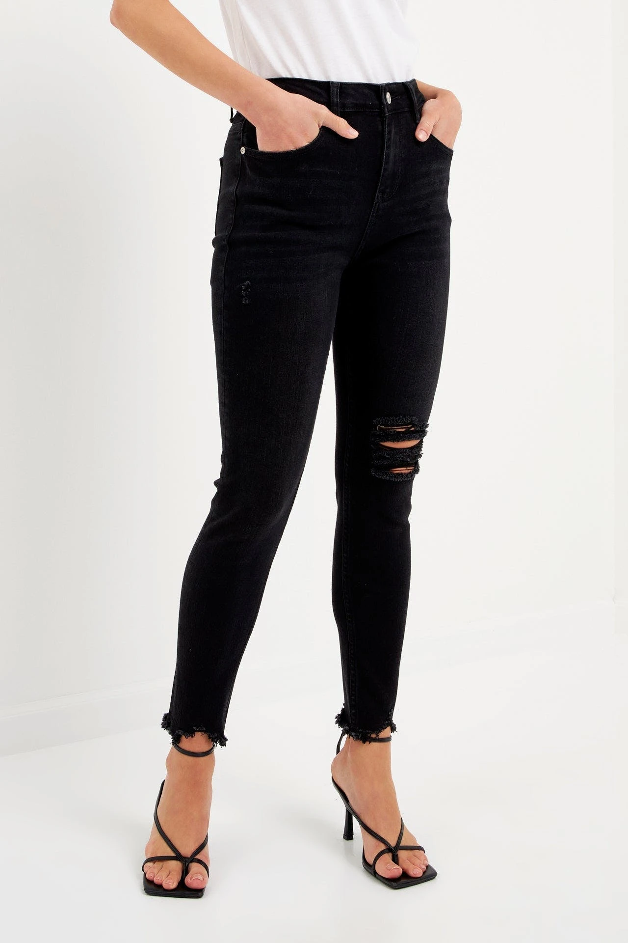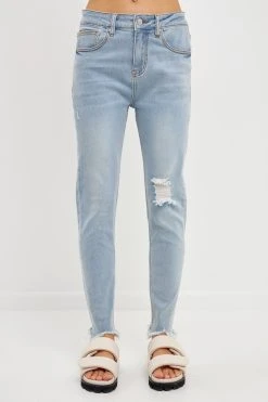 Add destroyed details to your denim look. The grey lab destroyed skinny jeans are a must have in every fashionista’s wardrobe. With a destroyed hem and five pocket detail, these jeans add edge to any outfit, wear these with anything.