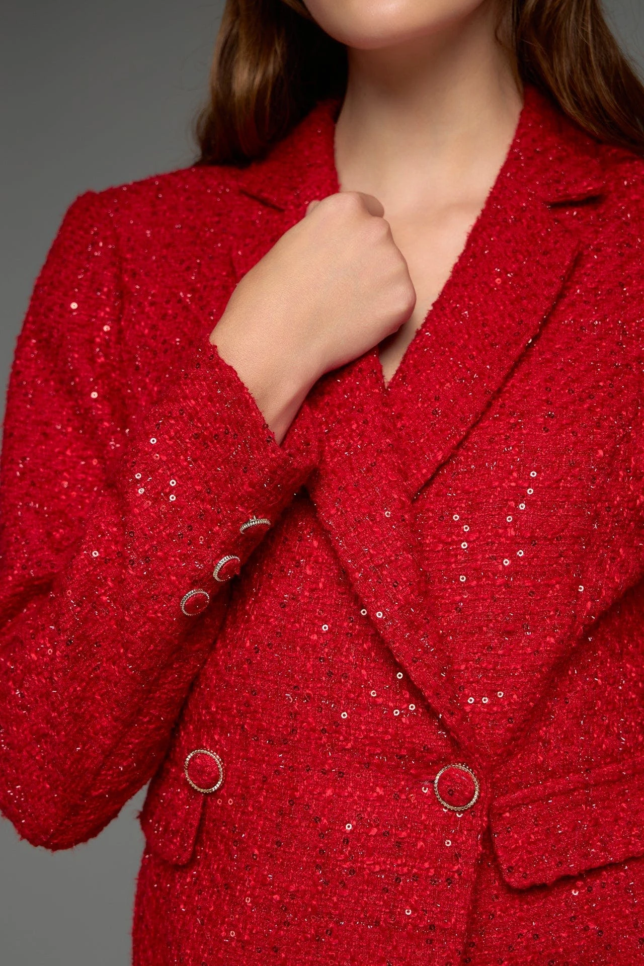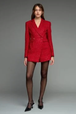 Throw on this blazer romper and you’re ready for a night to remember! Made with sequin tweed and gold-trimmed buttons, this blazer romper is perfect for any special event. Plus, the lining ensures you’re comfortable so you can wear it for as long as you’d like. The shoulder pads and double-breasted style juxtapose the otherwise feminine piece, creating an eye-catching look.