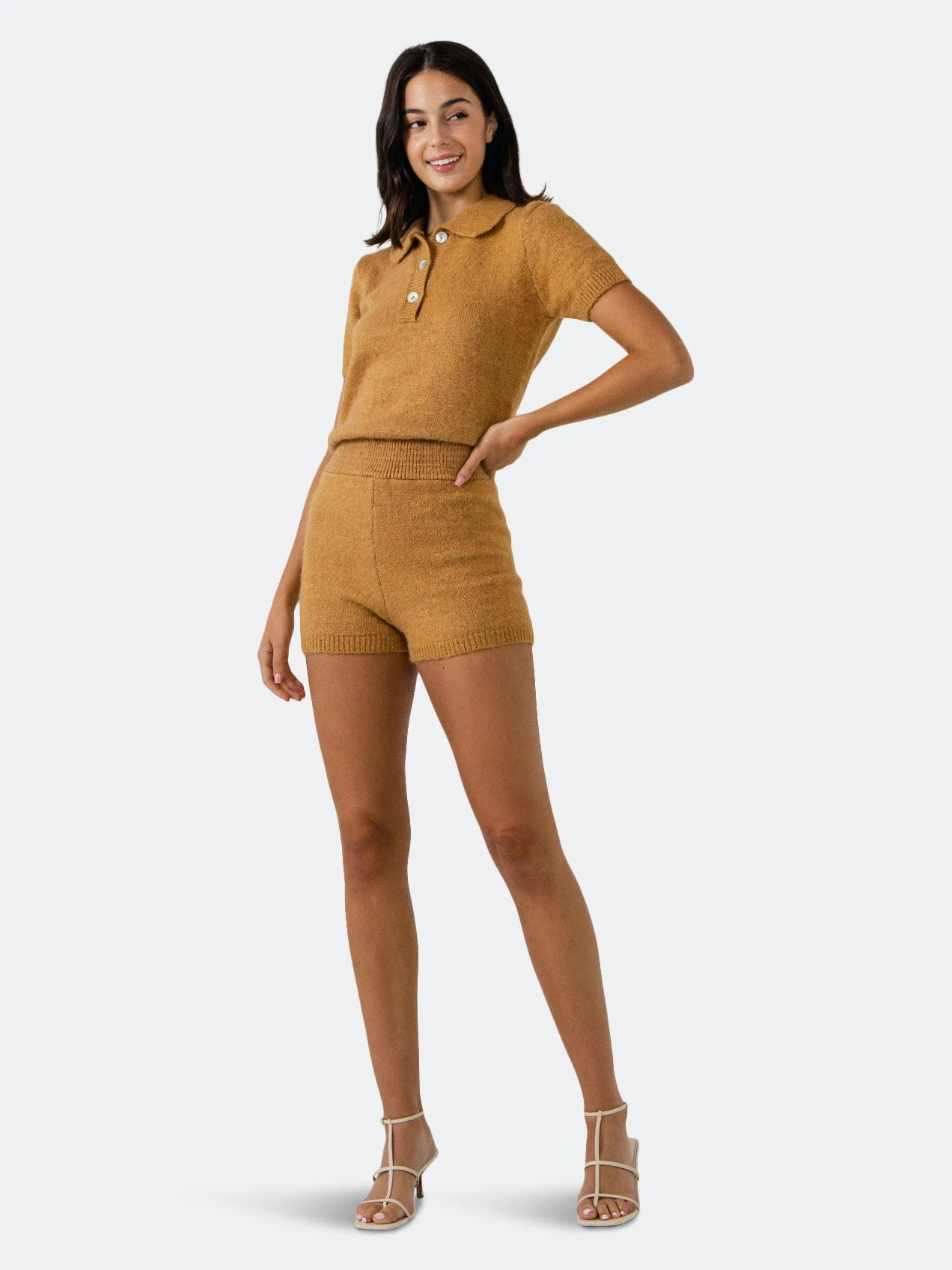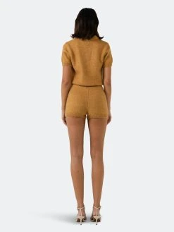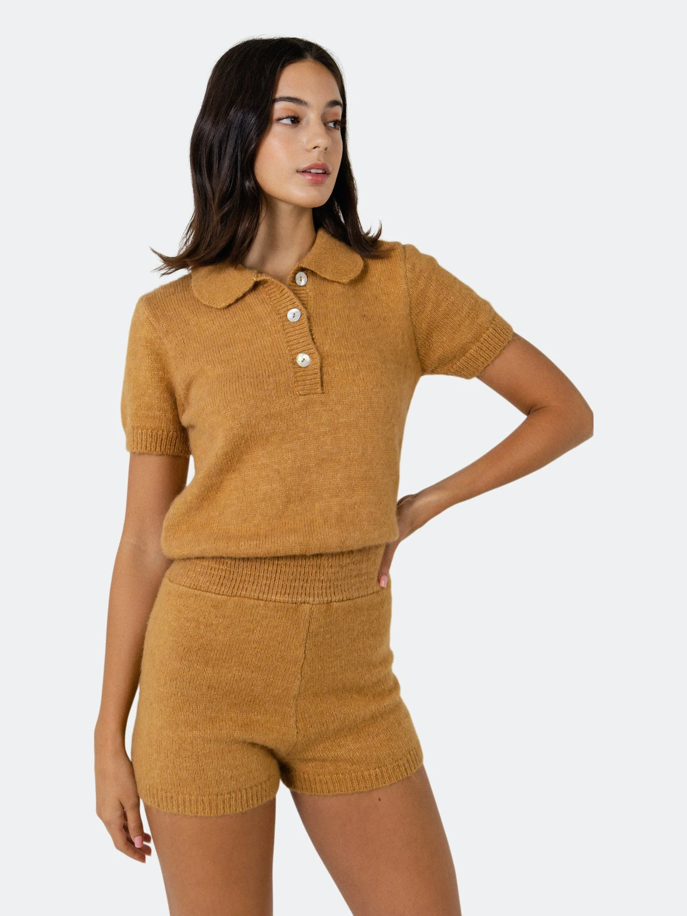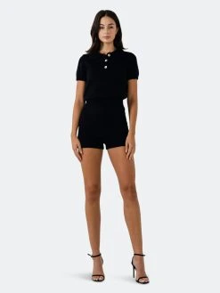 – Button and buttonhole- Short sleeve- Elastic inserted at the waist- Short length- Height 5’11″(180cm) / bust 32″(81cm) / waist 25”(64cm) / hip 36”(91cm)- Total length: 30.8″, bust: 33″, inseam: 2.5″
