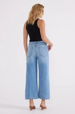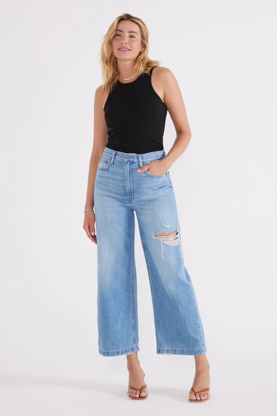 A wide leg jean with a high rise, in a soft cotton/Refibra blend denim with a soft hand and a fluid drape. Careful fading and thoughtful destruction add to the vintage vibe.