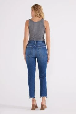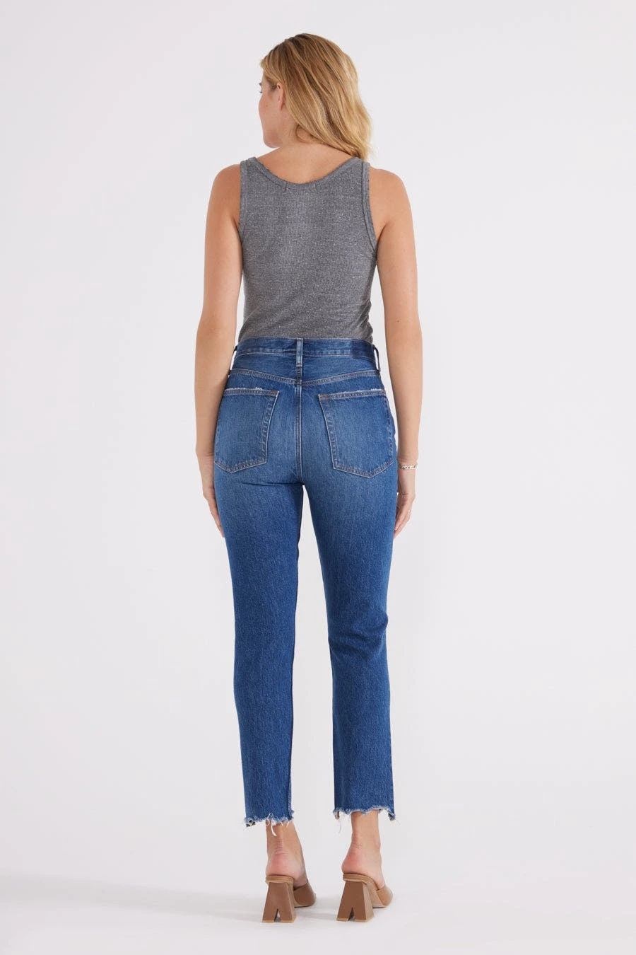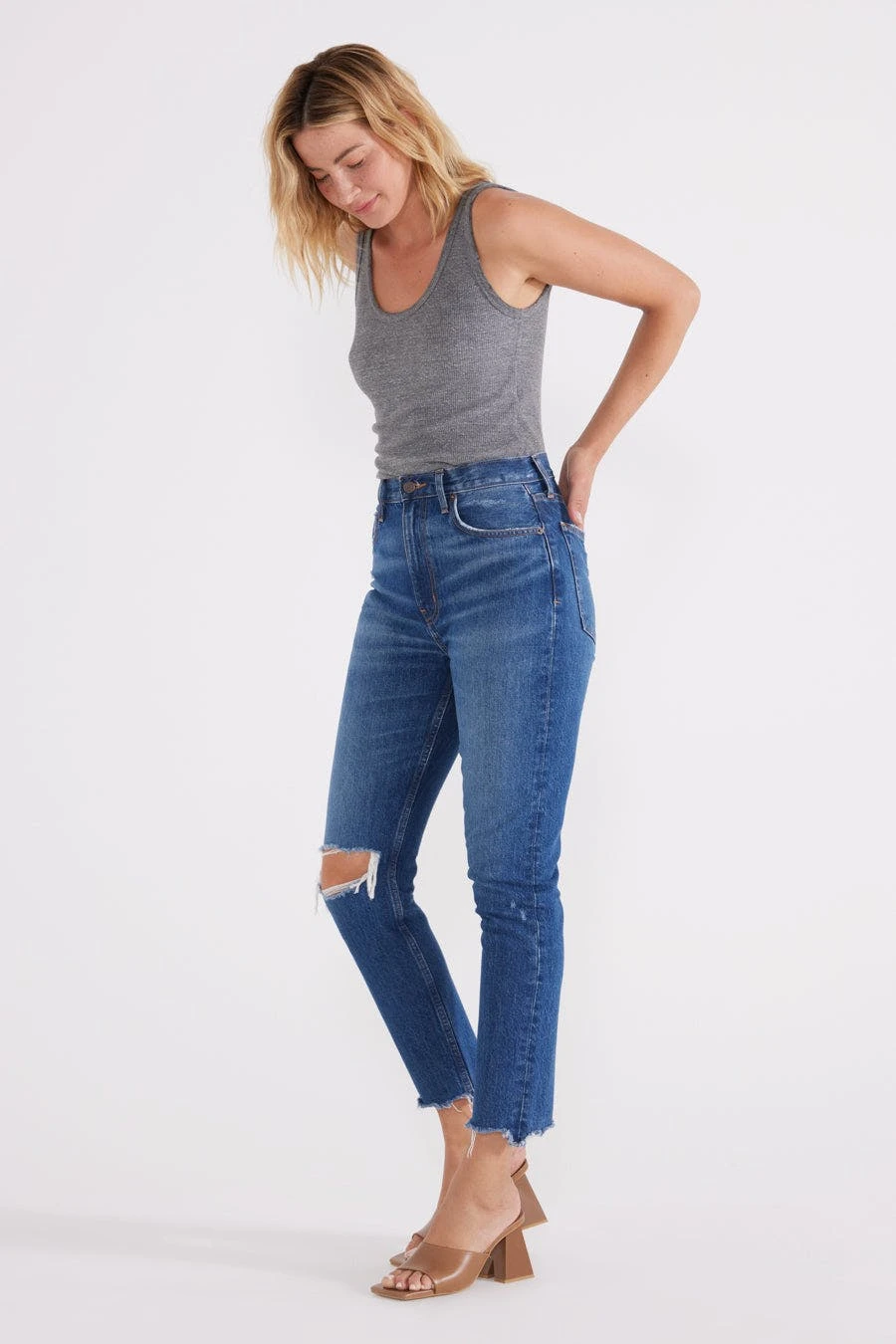 A slim fit with a high rise and vintage construction, Marcella gets a bit of an edge from this dark wash with authentic destruction.