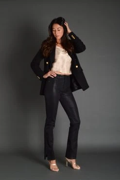Slinky and sexy this high-rise straight is dressy and ready to party. Coated in our softest royo stretch fabric. The 7″ inch side slit at the ankle give a peek-a-boo to your shoe.
