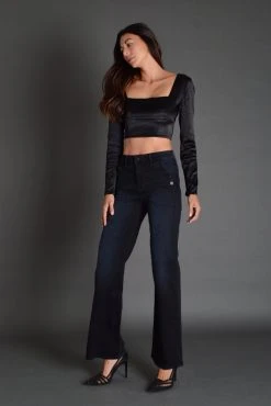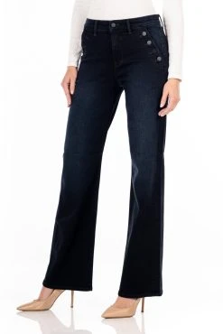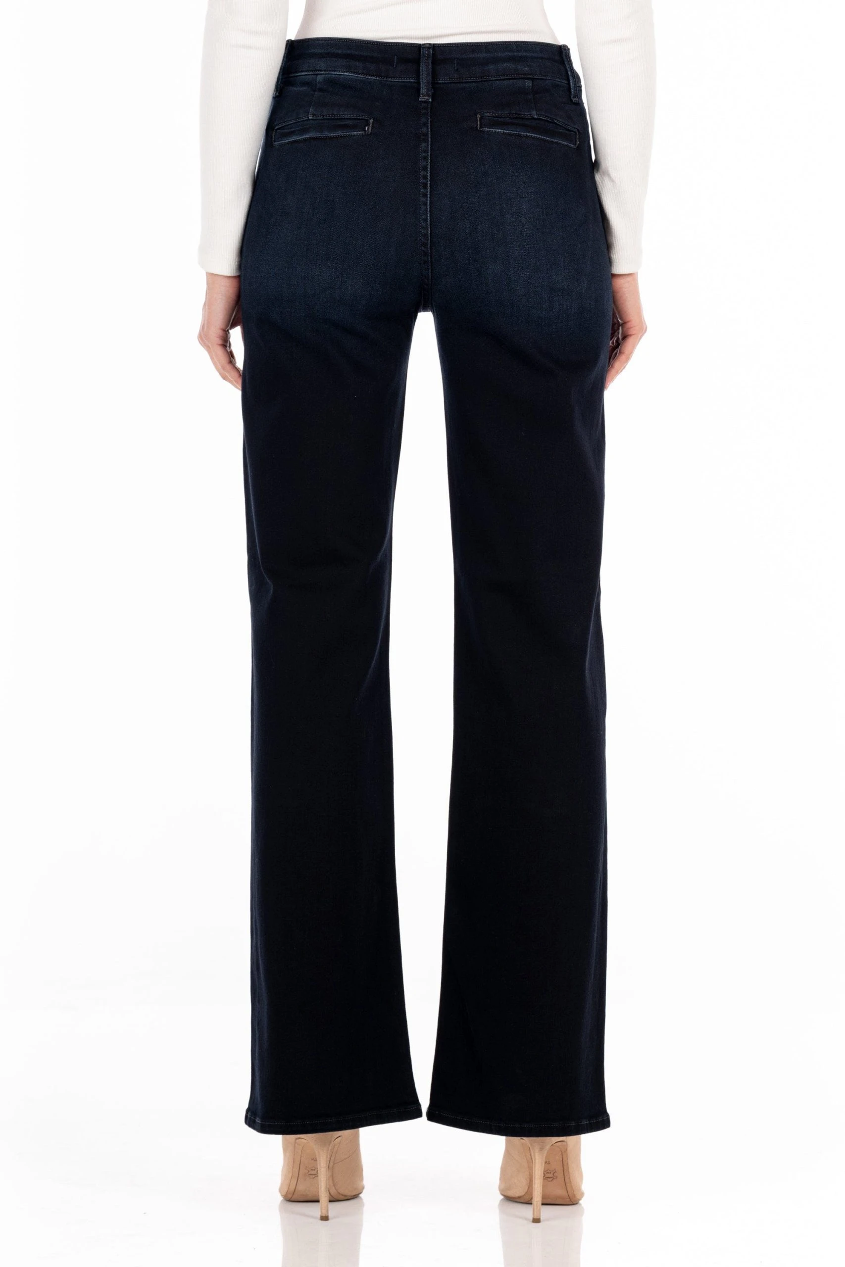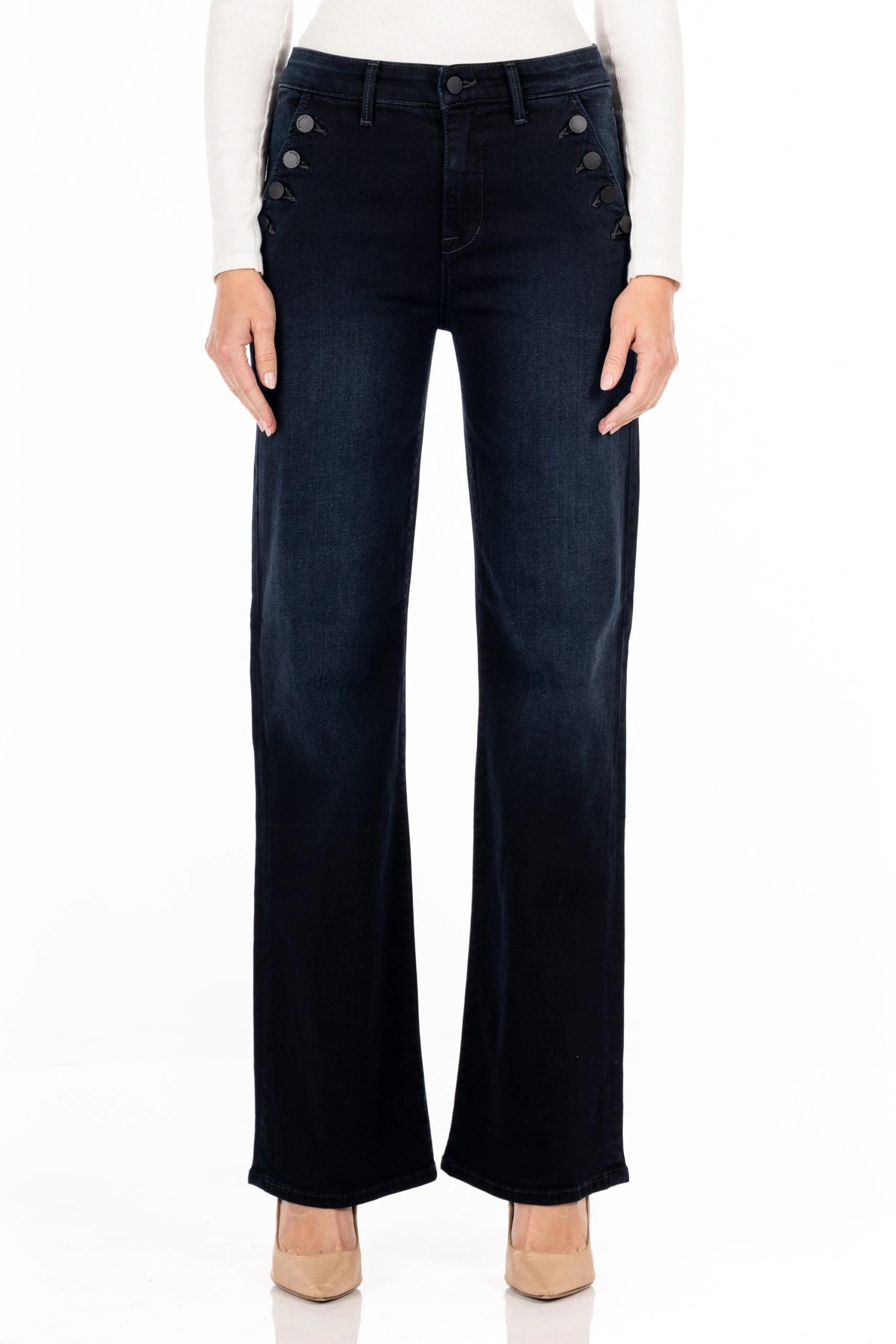 A trouser fit with black side button detail. This rich Black Bourbon is rich and dark wash, fitted at the hips and drapes to a soft flare at the ankle. Made in the Elite denim. Elite is Italian Candiani denim that is BCI, RINA and Confidence in Textiles certified. The finest responsibly sourced cotton, fibers and dyes.