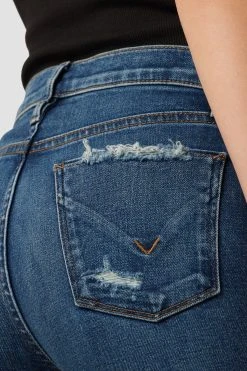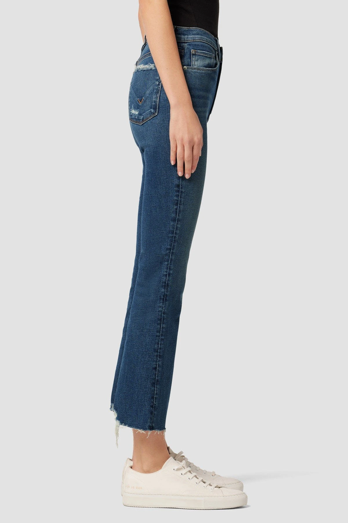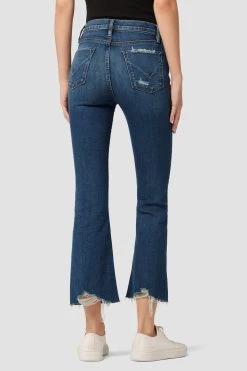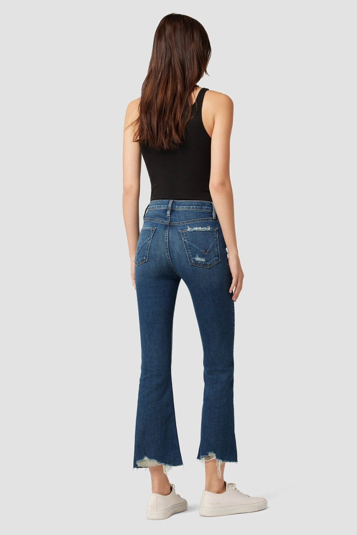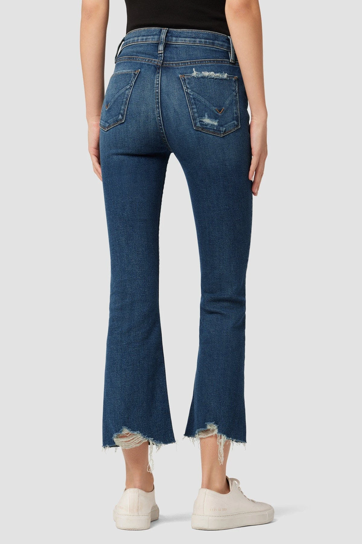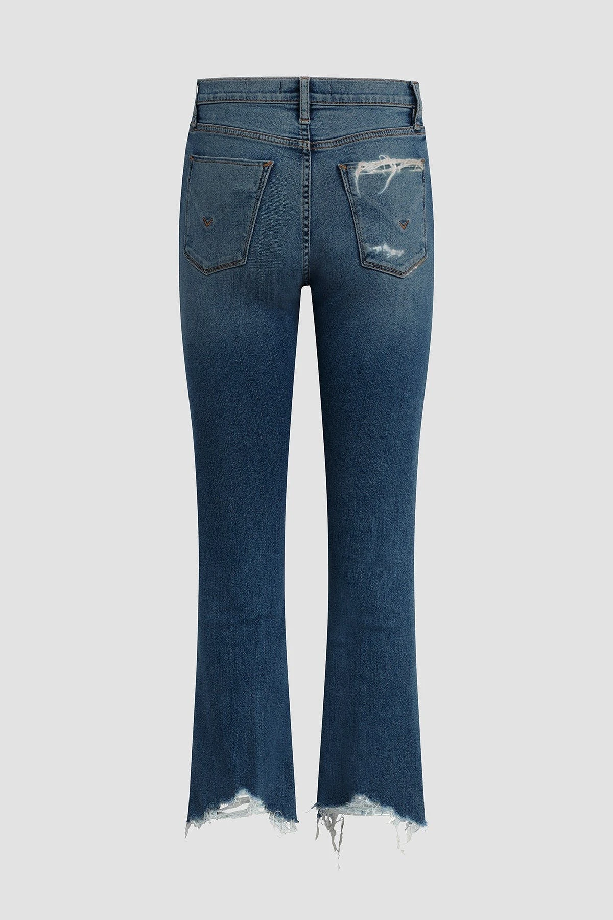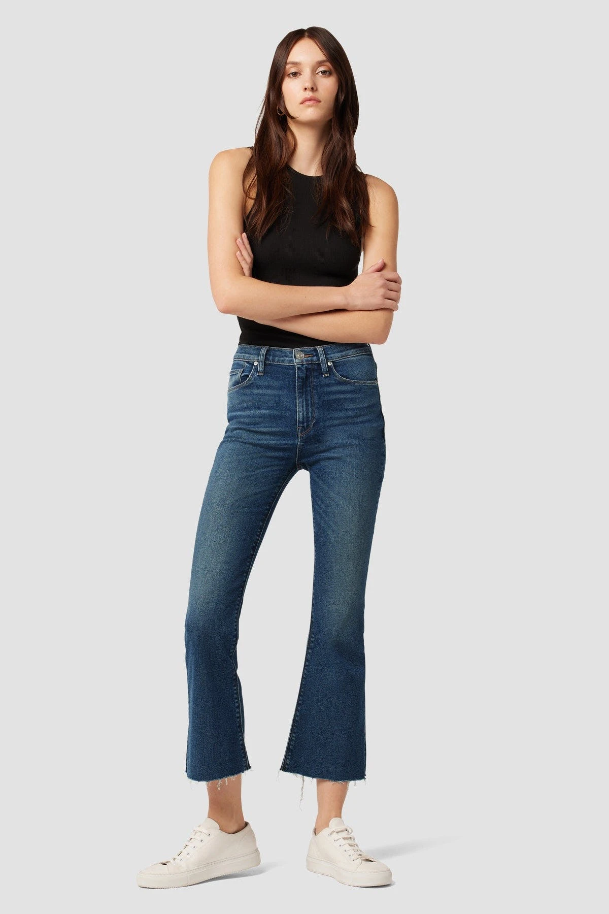 Cut from premium stretch denim, this barbara high-rise bootcut crop jean in medium indigo secrets features a slim, contoured fit with an elevated waistline, flared cropped leg, and cutoff hem.
