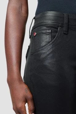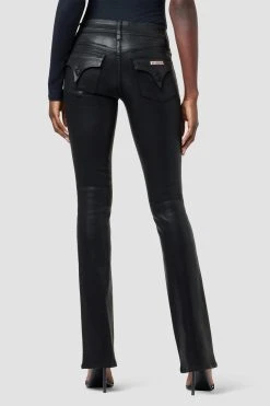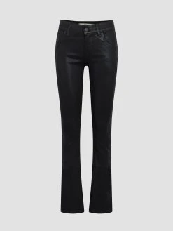 Cut with premium super stretch denim, Beth Mid-Rise Baby Bootcut Jean in Coated Black Beauty features a subtly flared silhouette and this signature button-flap back pockets.