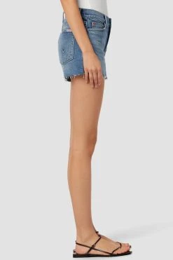 Our high rise bermuda short, sizes 7-16, in light indigo max fade features a high-rise waist and frayed hems that hit just above the knee.