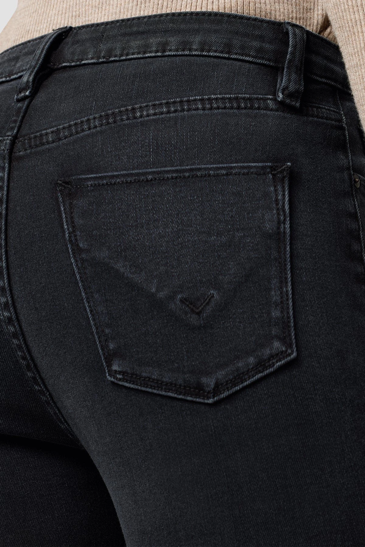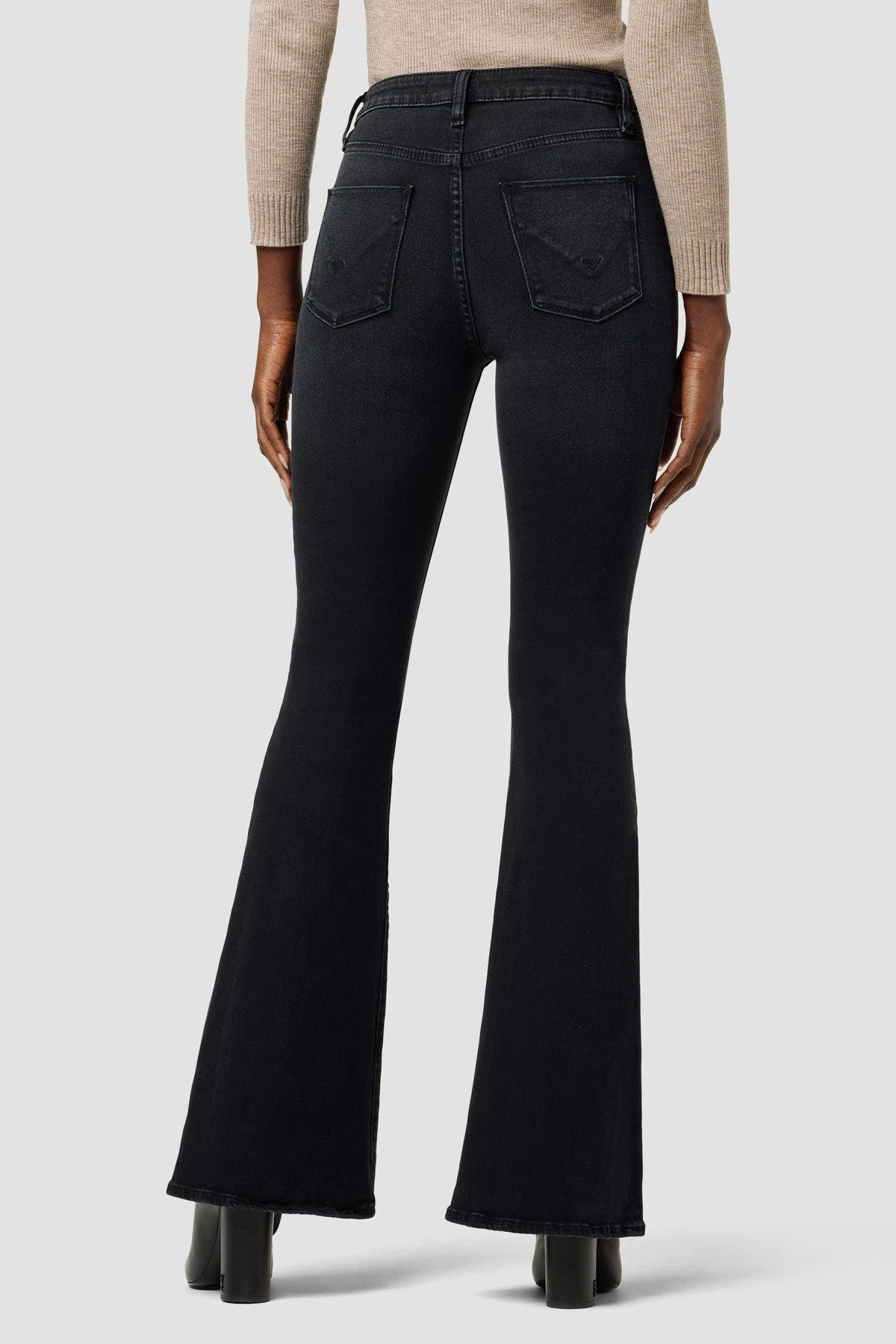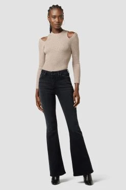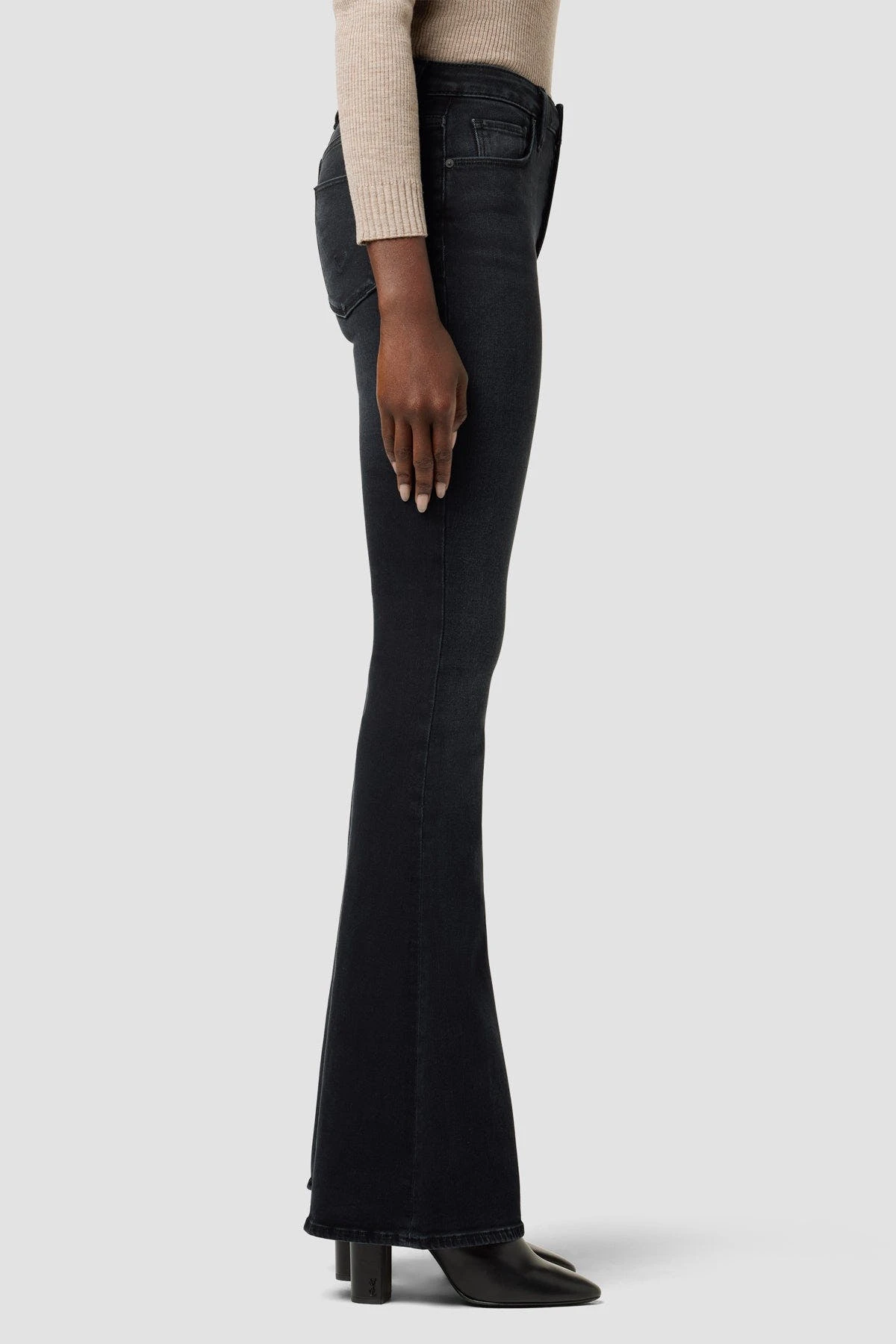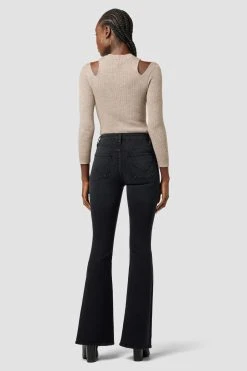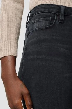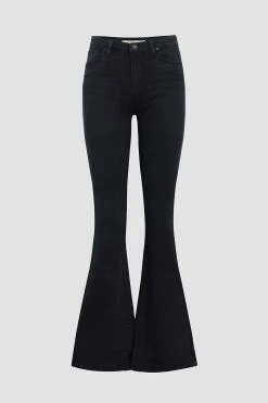 The Holly High-Rise Flare Jean in Noir is cut from premium stretch denim. Features an elevated waistline, slit hems, and a fitted leg that breaks at the knee.