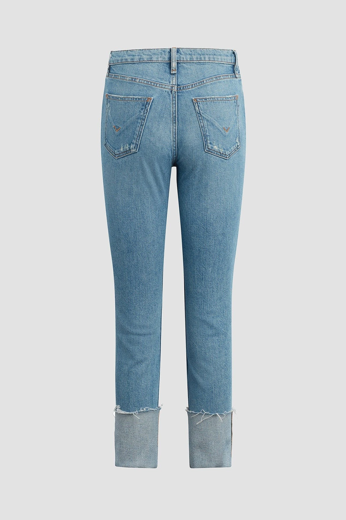 This Holly High-Rise Straight Ankle Jean in medium indigo Landslide is cut from premium comfort stretch denim washed and distressed to vintage perfection. Features a button fly, classic five-pocket details and raw-edge cuffed hems.