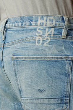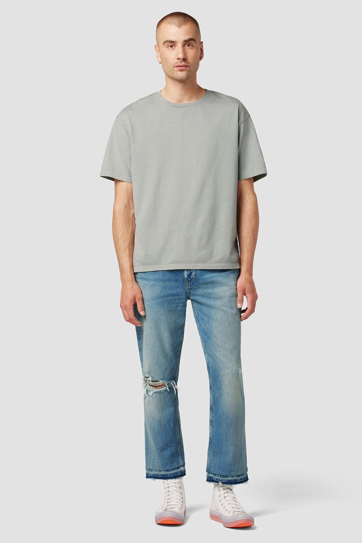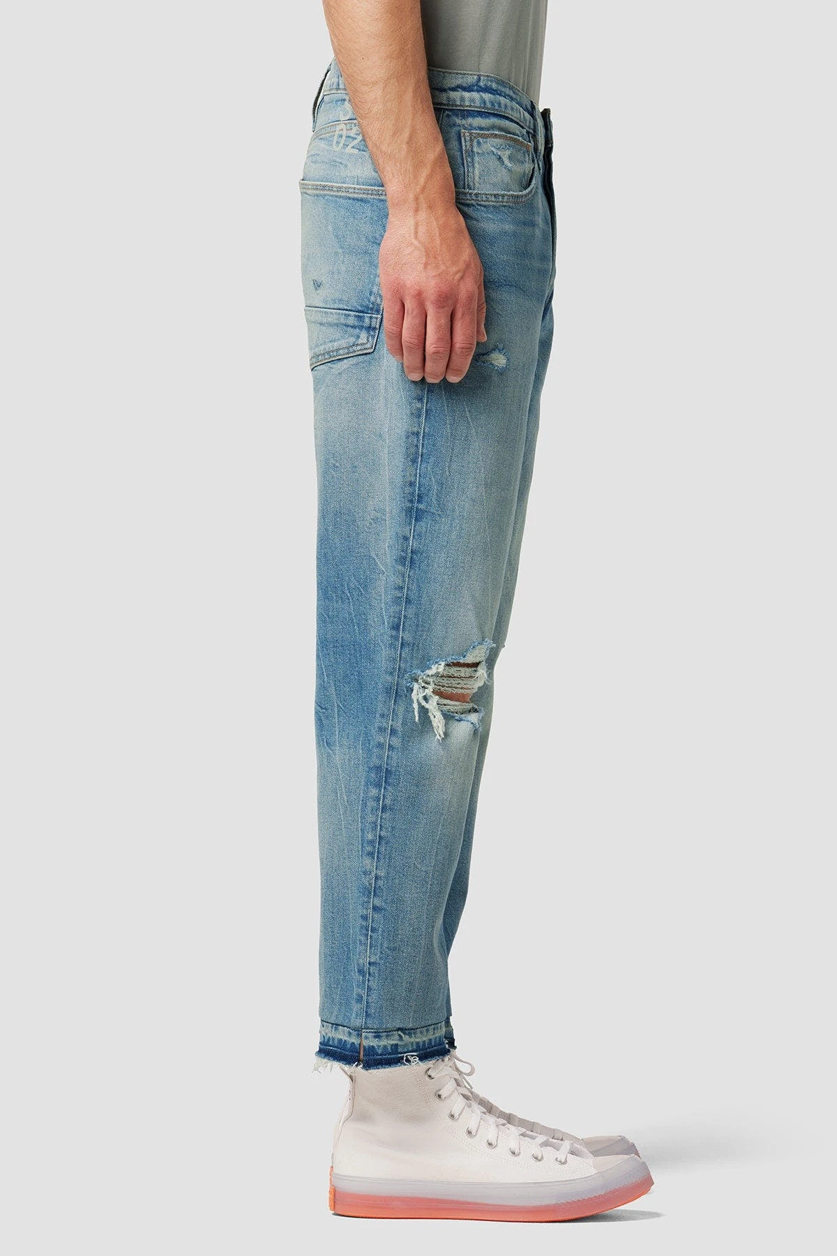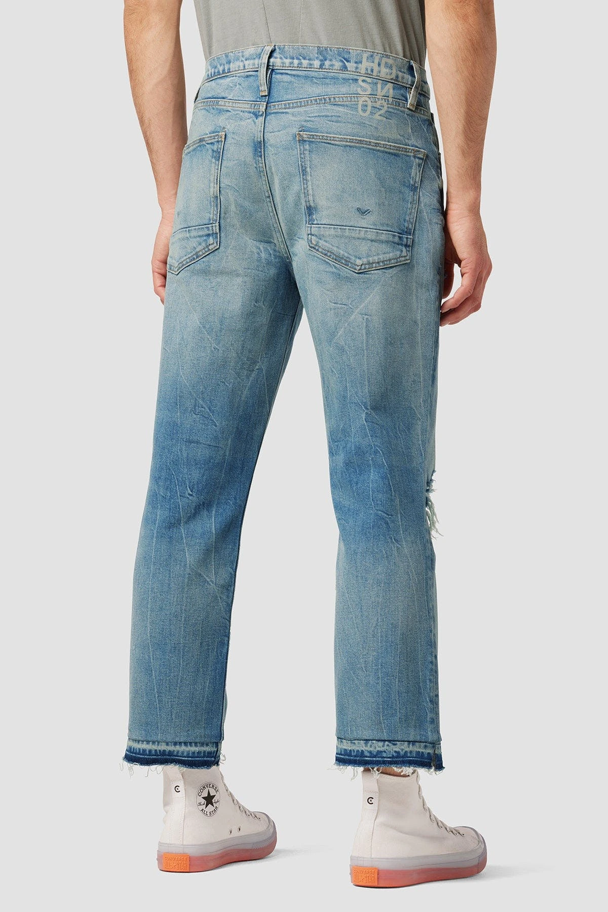 Reup with Reese, cut for a relaxed straight fit through the hips, thigh, and leg. The expertly destructed Half Cab wash is cut from premium comfort stretch denim a raw hem and classic five-pocket details.