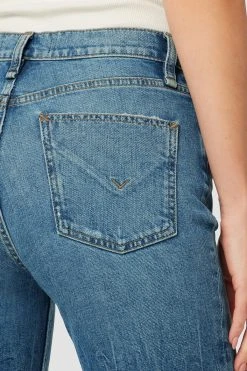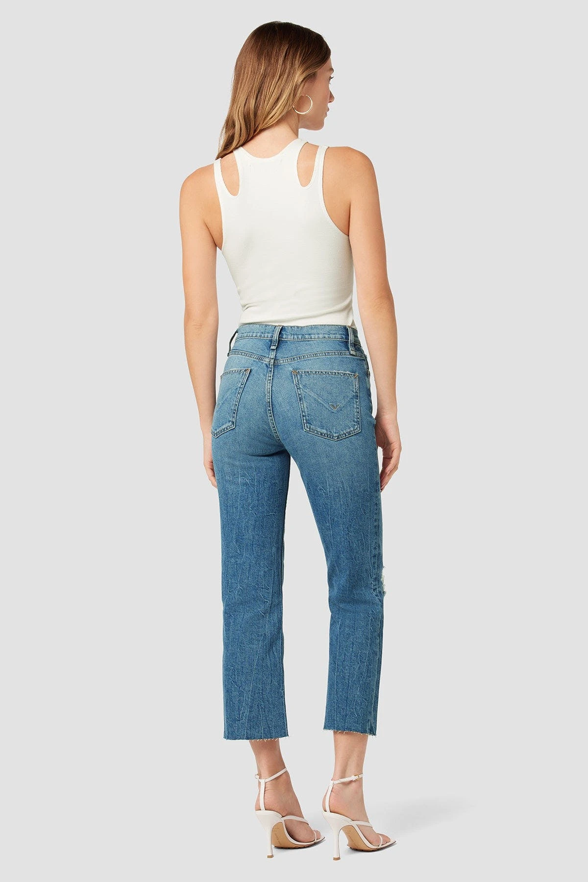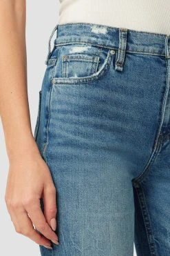 Like a ridiculously good vintage find, our remi high-rise straight crop jean is cut with a flattering high rise and cropped relaxed leg. the medium indigo stunner wash is made from premium comfort stretch denim with destruction, a raw hem, and classic five-pocket details.