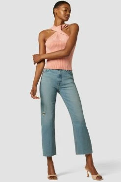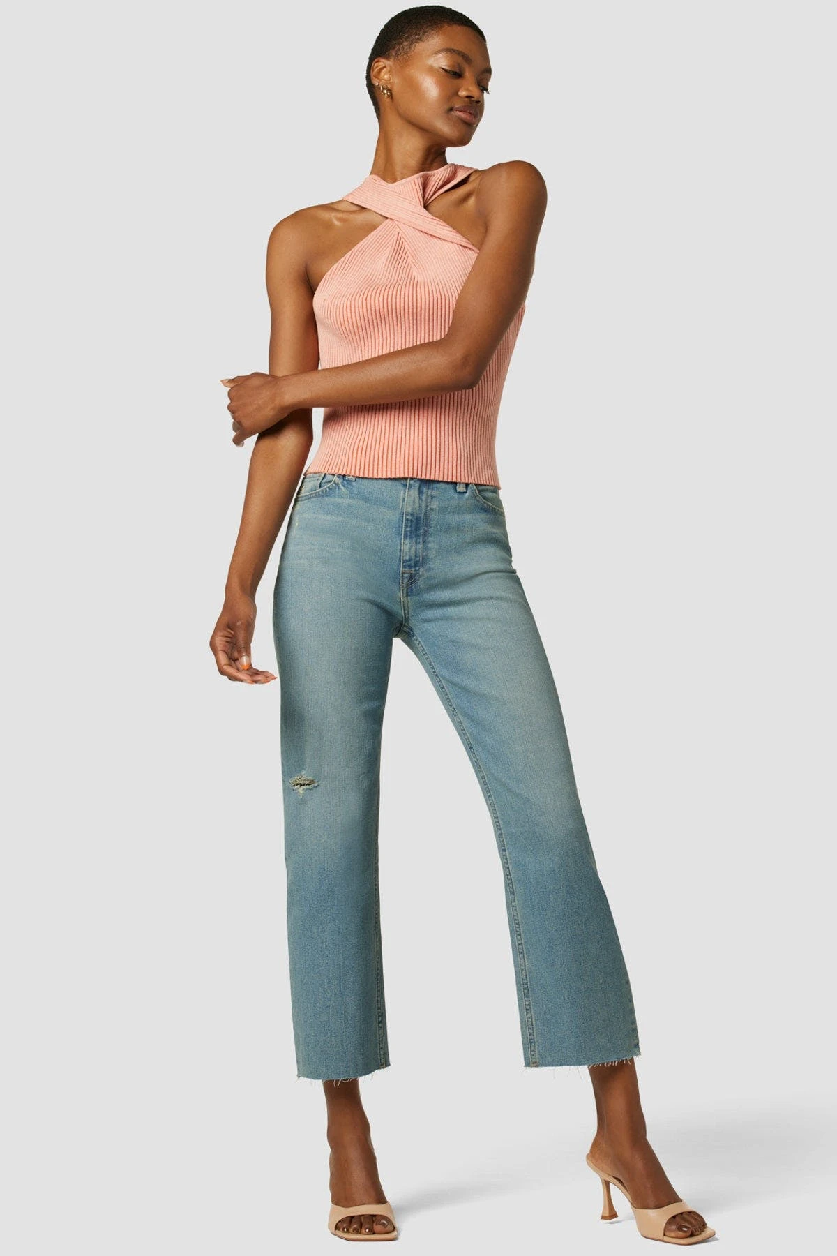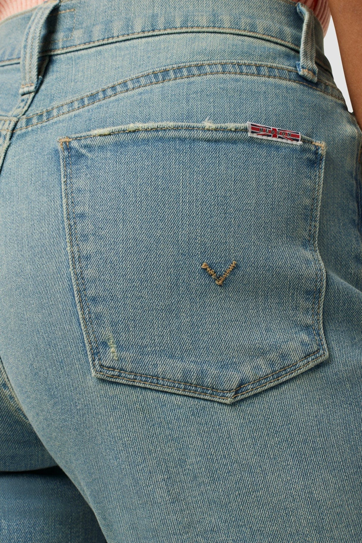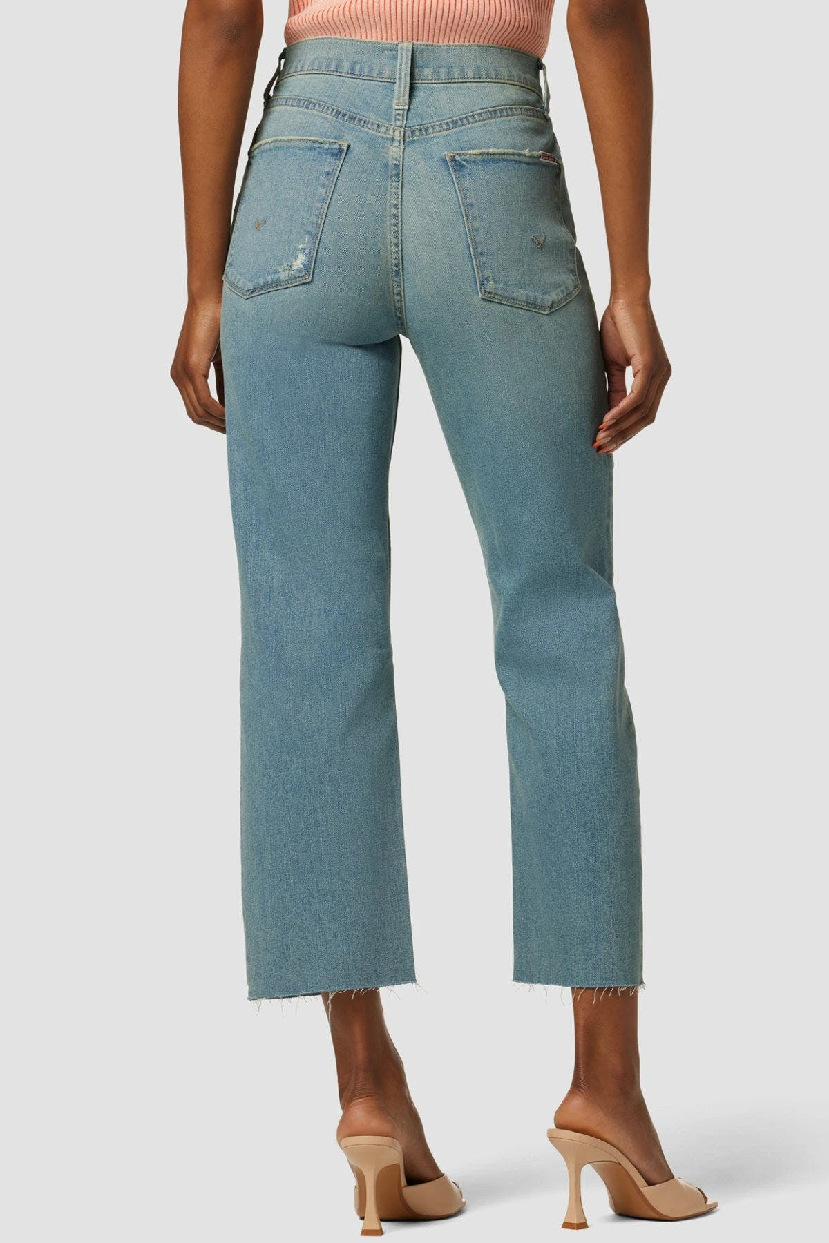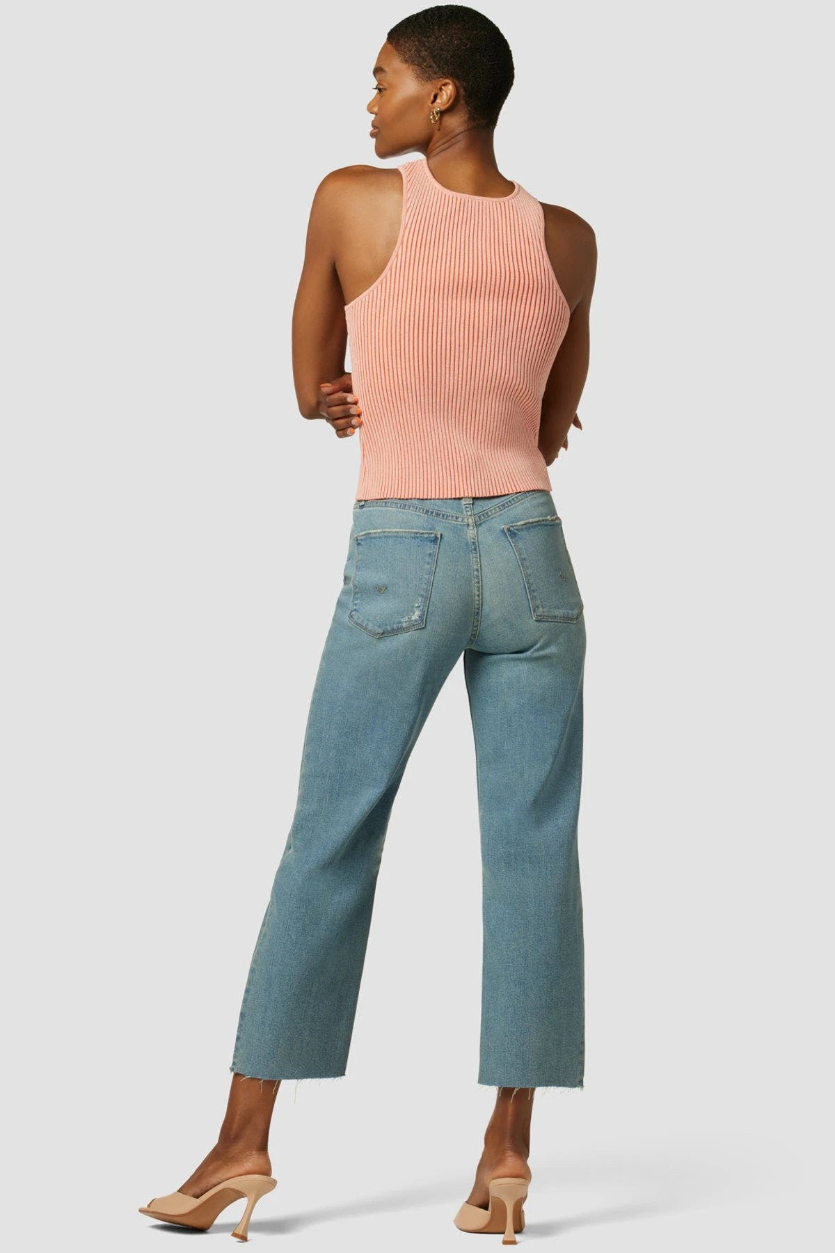 V-shaped stitching details the back pockets of wide-leg jeans cut with a high waist and raw, slightly ragged hems.