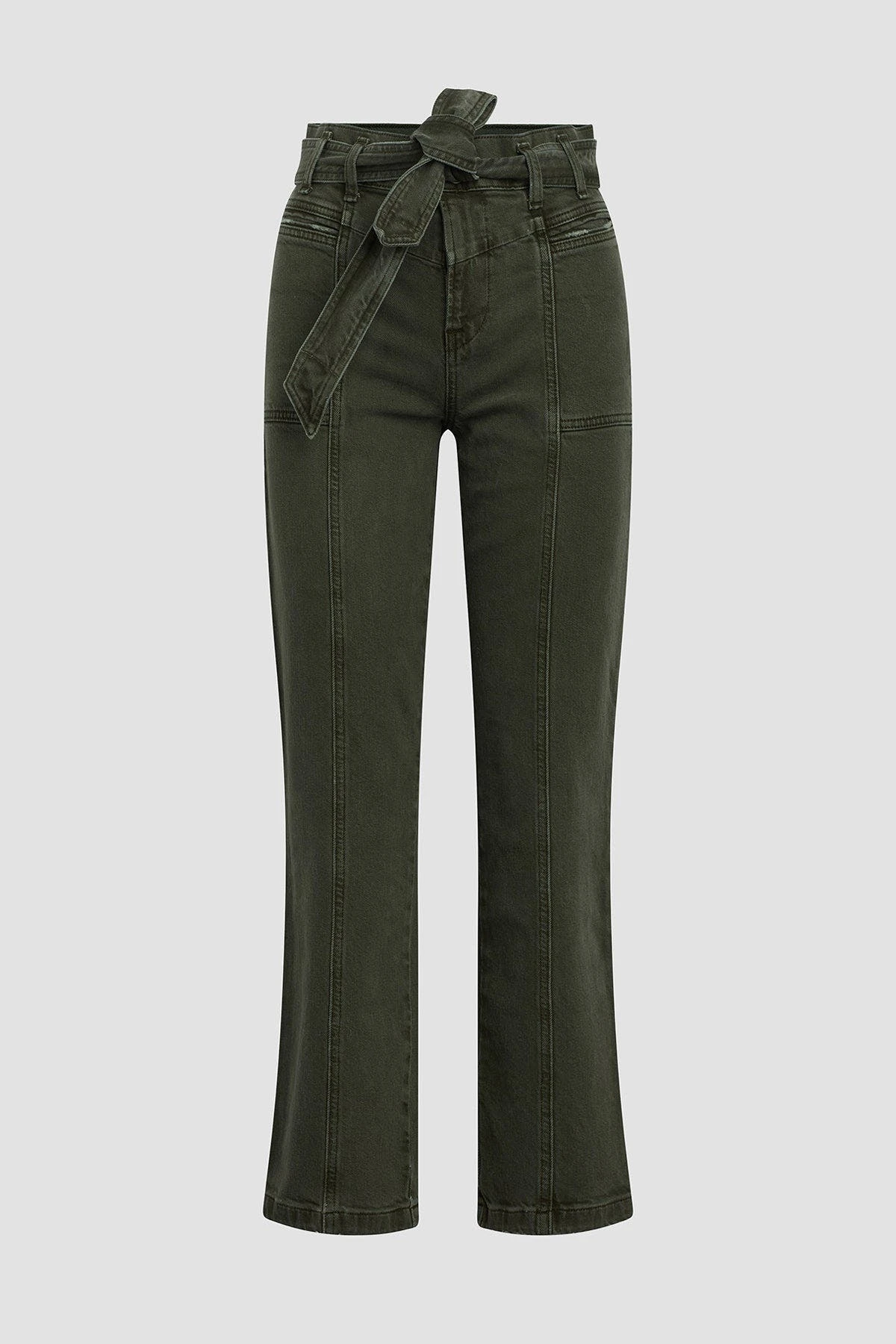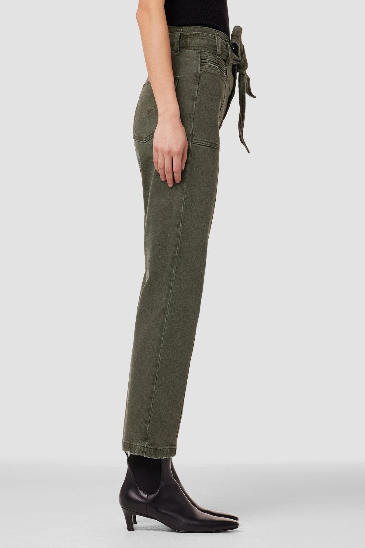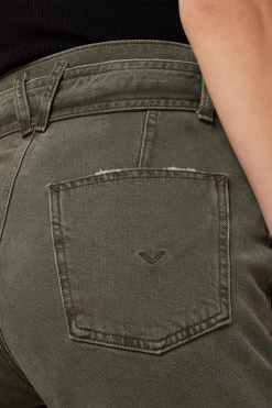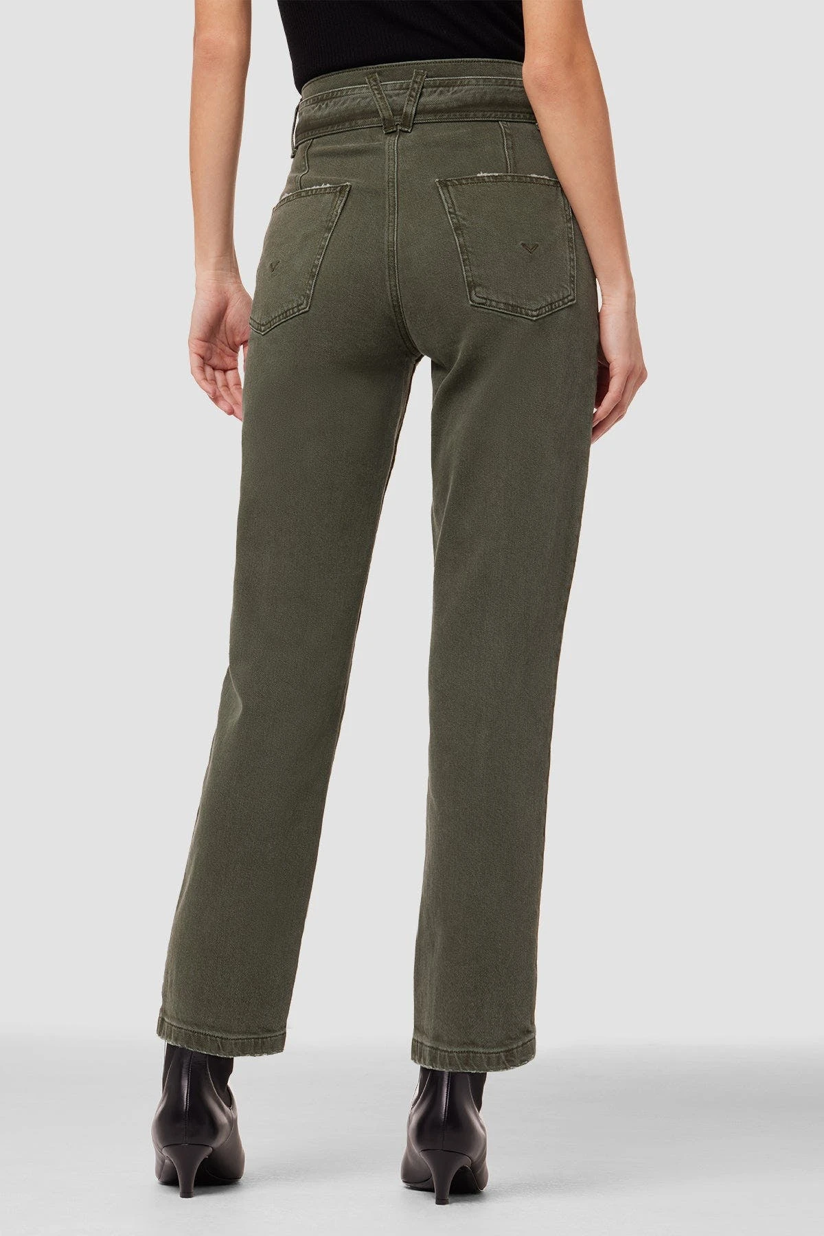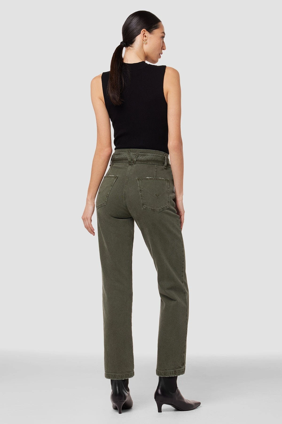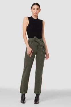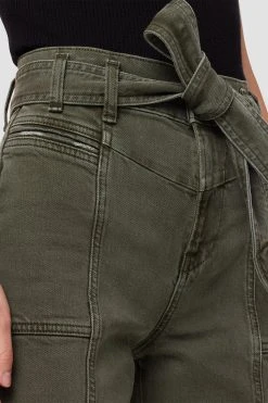 This Utility Straight Ankle Jean in Rifle Green is cut with a high rise and cropped leg from premium denim with a hint of stretch. Features an adjustable belt and distressing for extra character.