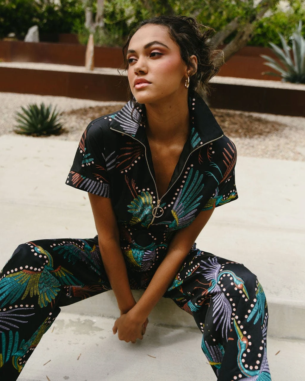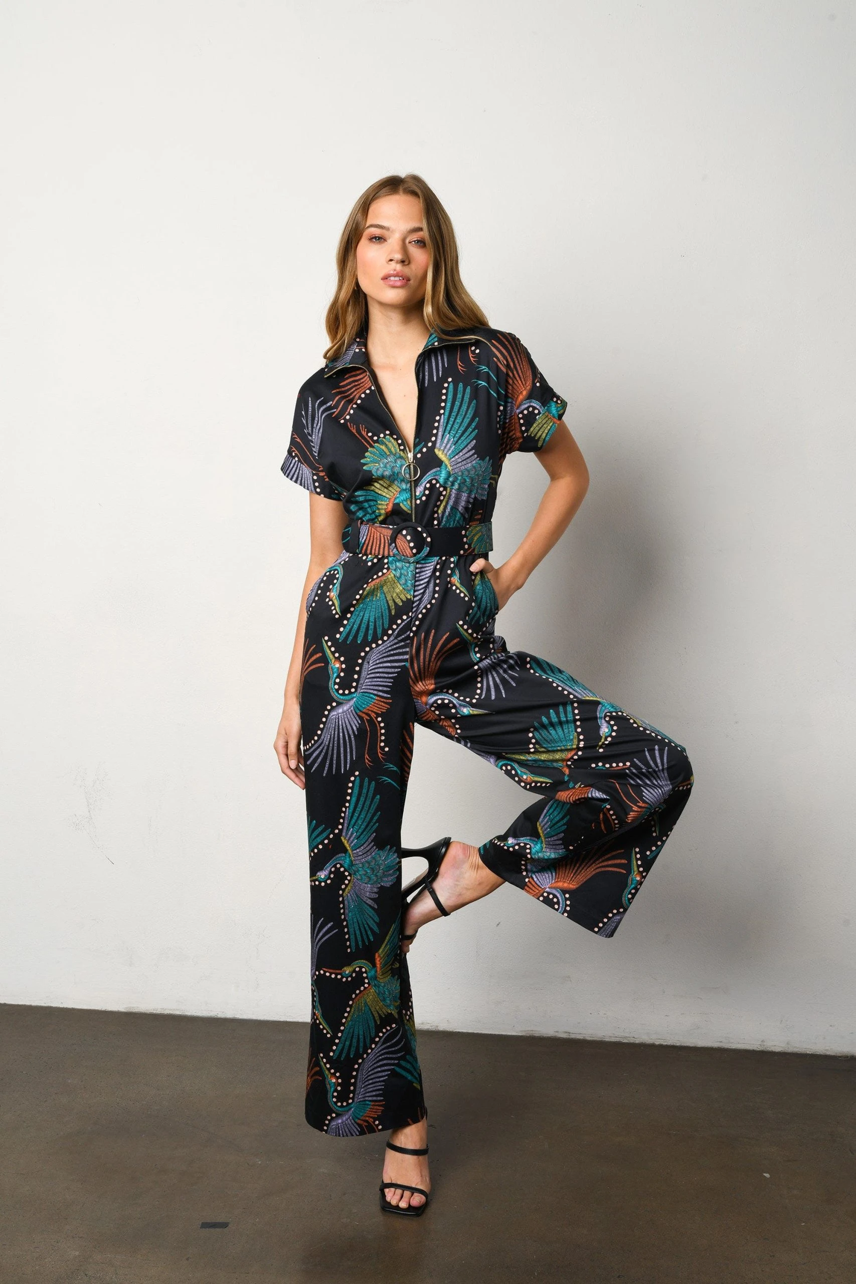 – Collared short sleeve jumpsuit with adjustable self belt- Zipper neckline detail- Slight wide leg pant- Pockets- 59.5″ from hips