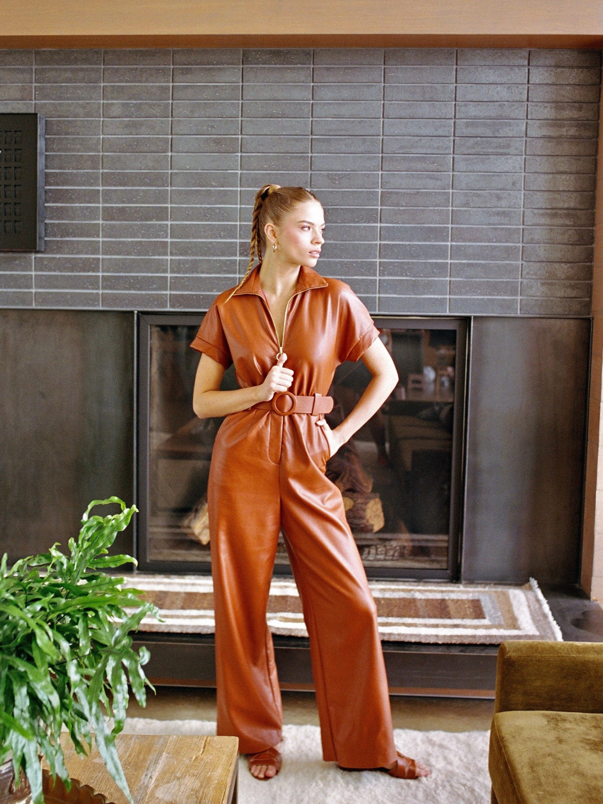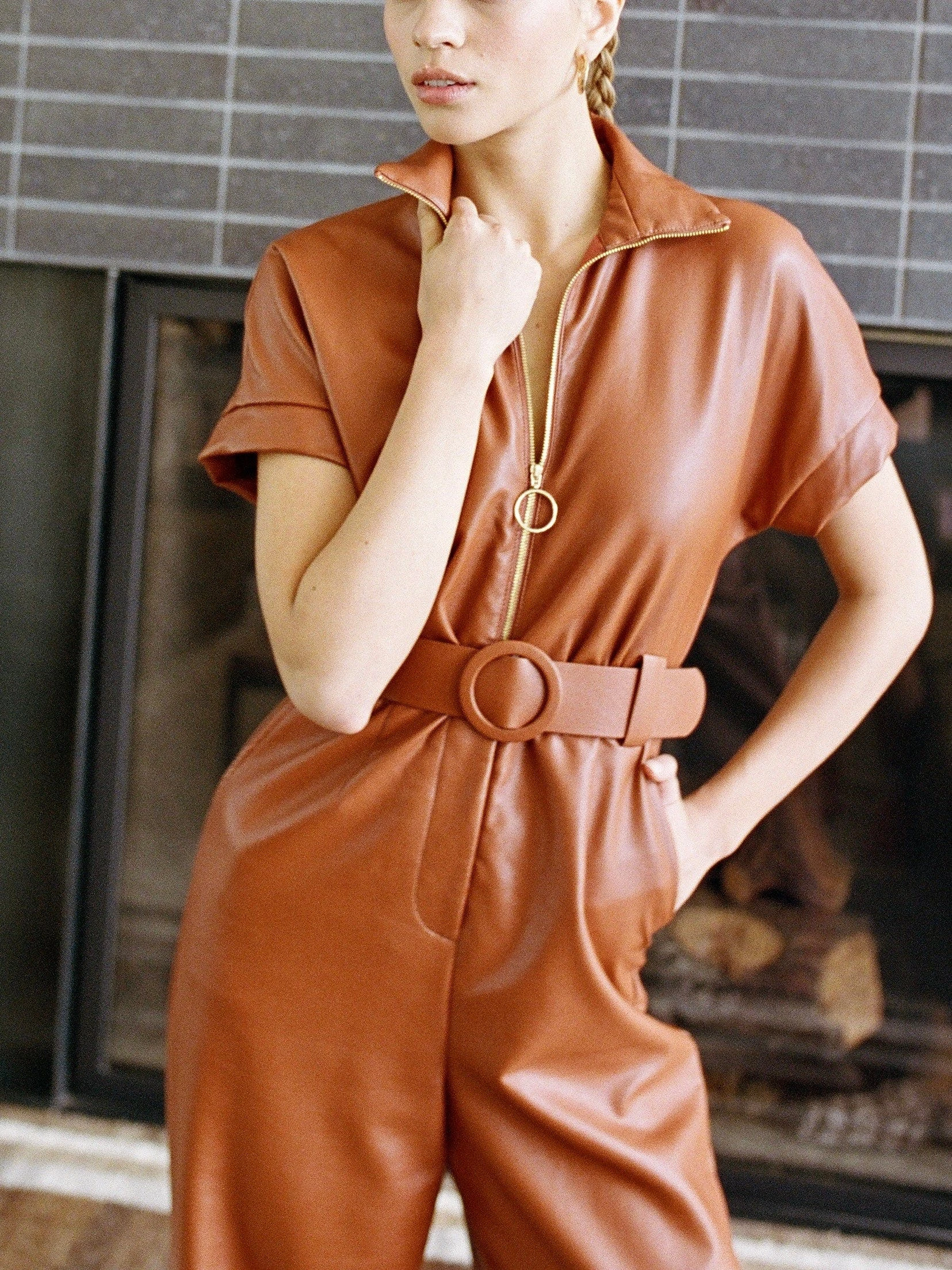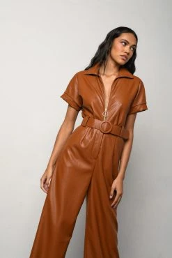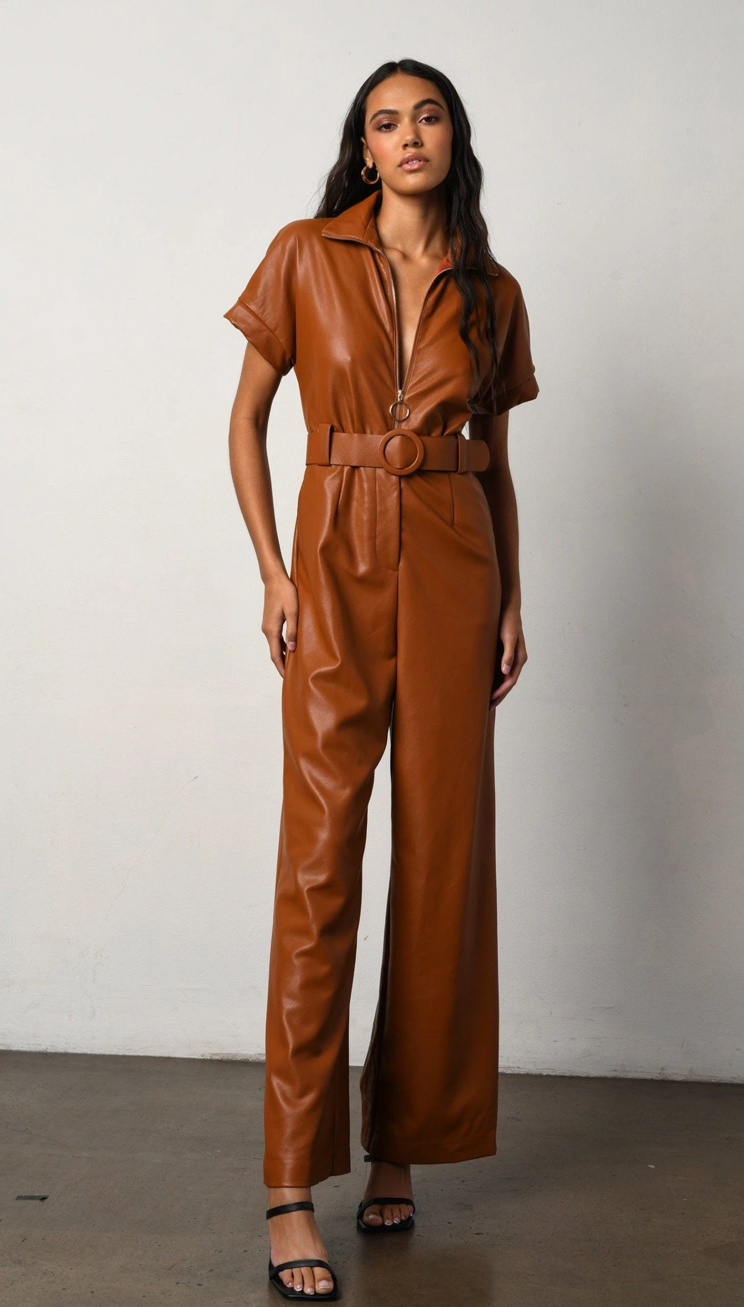 – Collared short sleeve jumpsuit with adjustable self belt- Zipper neckline detail- Slight wide leg pant- Pockets- 59.5″ from hips