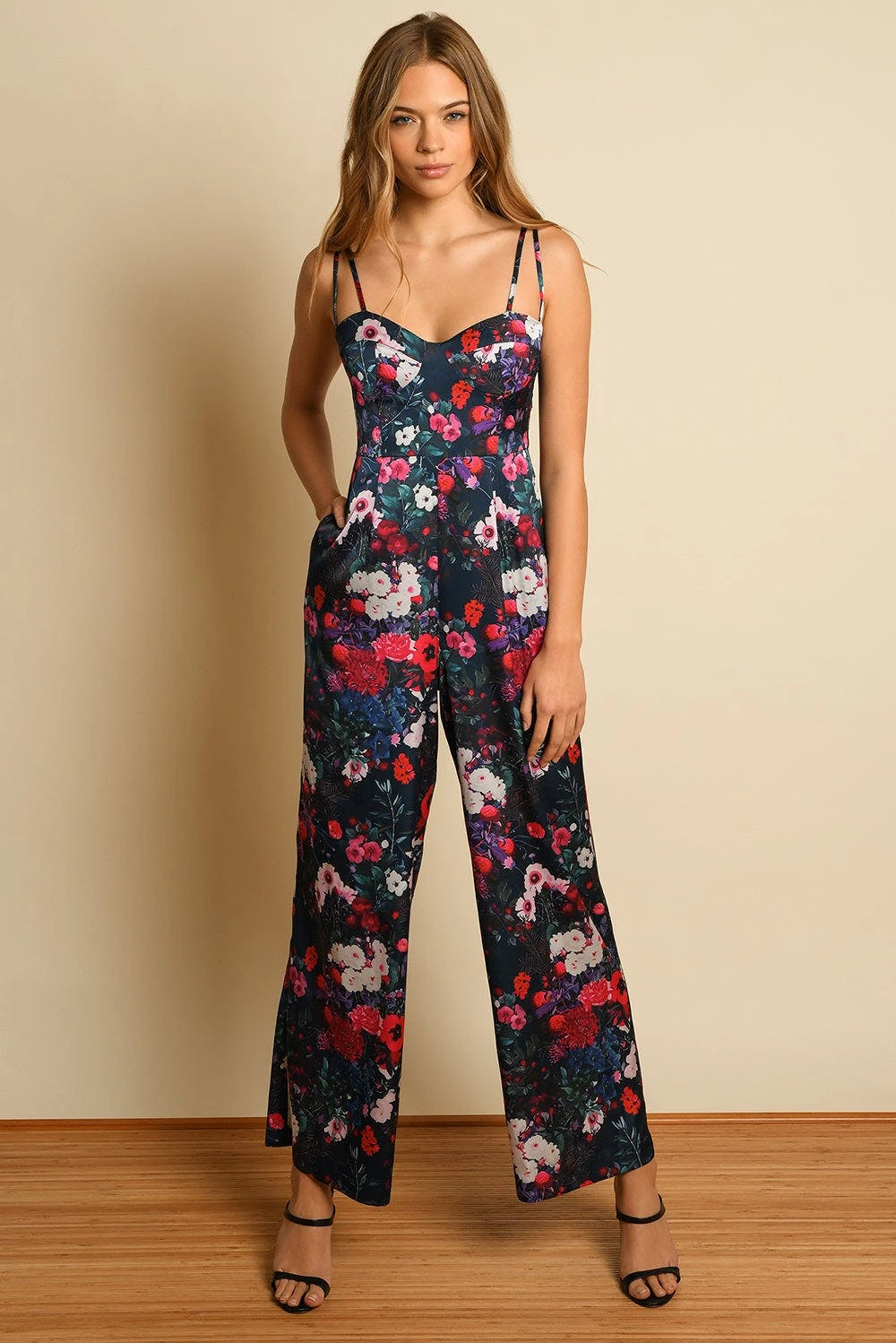 – Bustier style jumpsuit- Floral satin- Double strap detail- Pockets- Center back zipper- 59.5″ from HPS