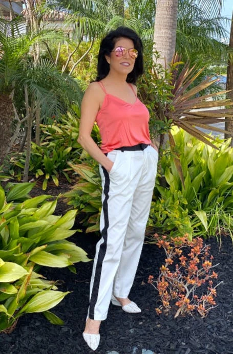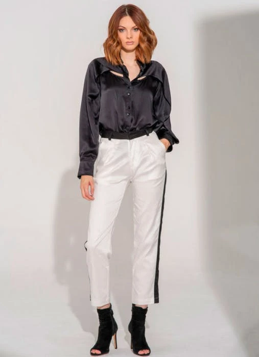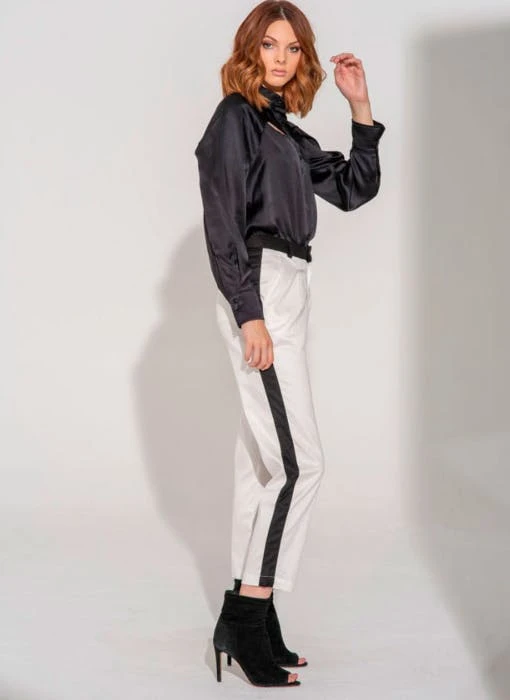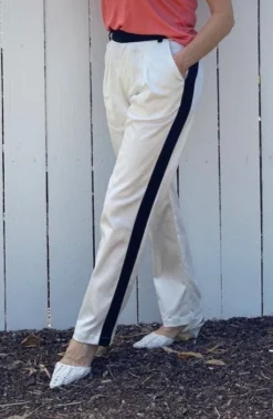 The Rhodes White pant is made in upcycled white cotton twill with a slight stretch. They have a front pleat, front pockets and back welt pockets. For the touch of detail we added a black sateen stripe down the side seams for that modern tuxedo look. The waistband is also in the contrasting black stretch sateen. Pair them with the new Thalia blouses, Santo blouses or any color top. This style also matches the Maxine jacket.