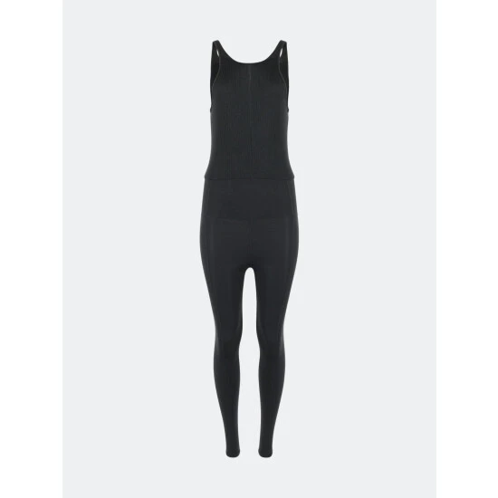 Flow through your yoga class without distraction in a figure-skimming silhouette jumpsuit made from stretchy compression fabric that wicks away moisture for cool comfort and a soft modal top.