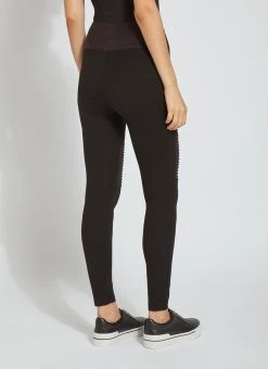 The Bonfire Moto Legging, crafted from 4-way stretch Ponte, showcases strategic seaming below the knee and Faux Suede pin tuck detailing above. Edgy and urban, these Black leggings offer a flattering, concealed patented waistband and Faux Suede back yoke. Wear them with a legging-friendly top and black lace-up boots.