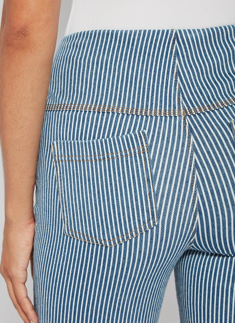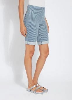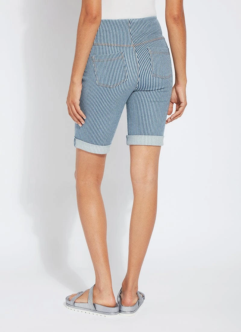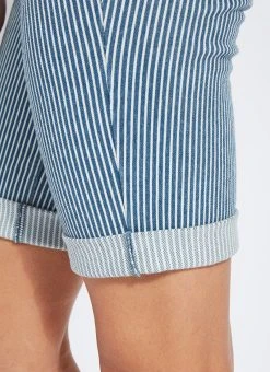 Boyfriend short pattern The biker-length boyfriend short pattern, in midwash pinstripe, showcases a concealed patented waistband, shapely back yoke, and patch pockets accentuated with light-gold metal studs. Combining relaxed comfort and on-trend styling, these biker shorts are constructed of 4-way stretch knit denim and perfectly accompany tees, tanks and tunics.