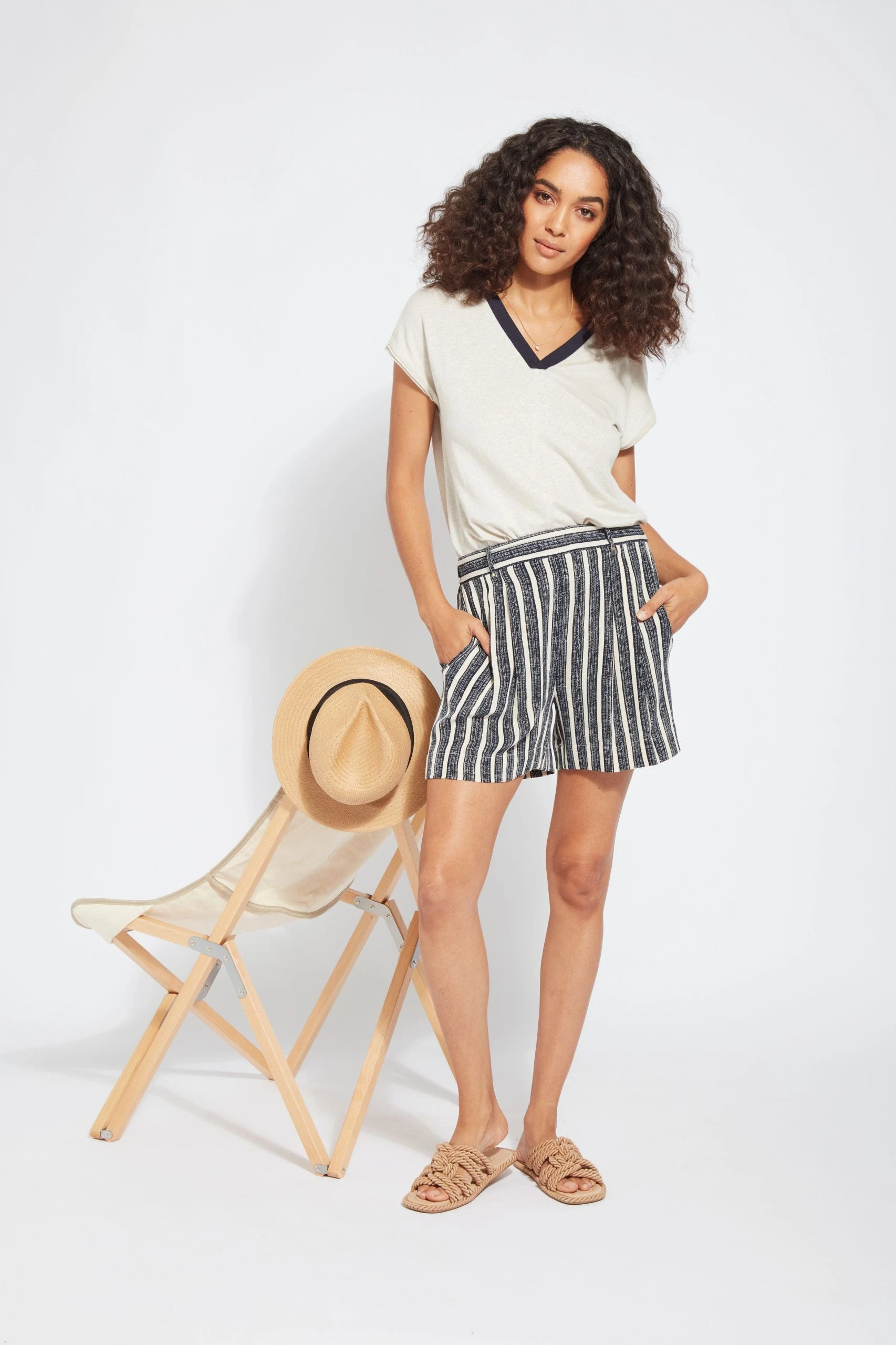 These comfy, wide-leg shorts showcase a front pleats, side pockets, a flat front waistband lined in tricot mesh, elasticated back waistband, back welt pockets and beltloops accented by light-gold studs. Showcase the cannes pleated short, fashioned from stretch woven fabric, with our linen jersey amalfi top, nude slides and brimmed sun hat.