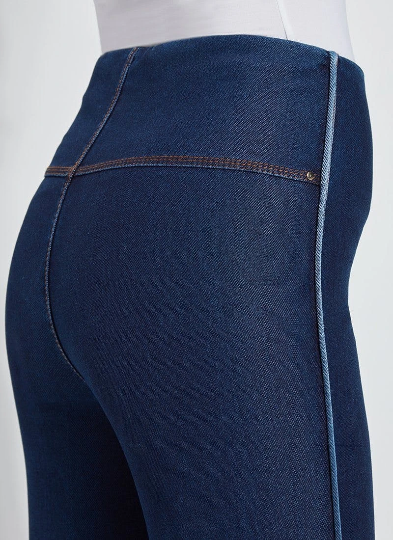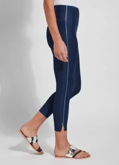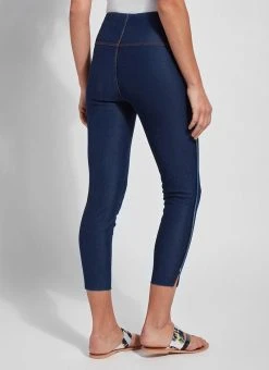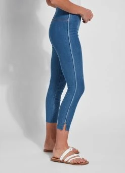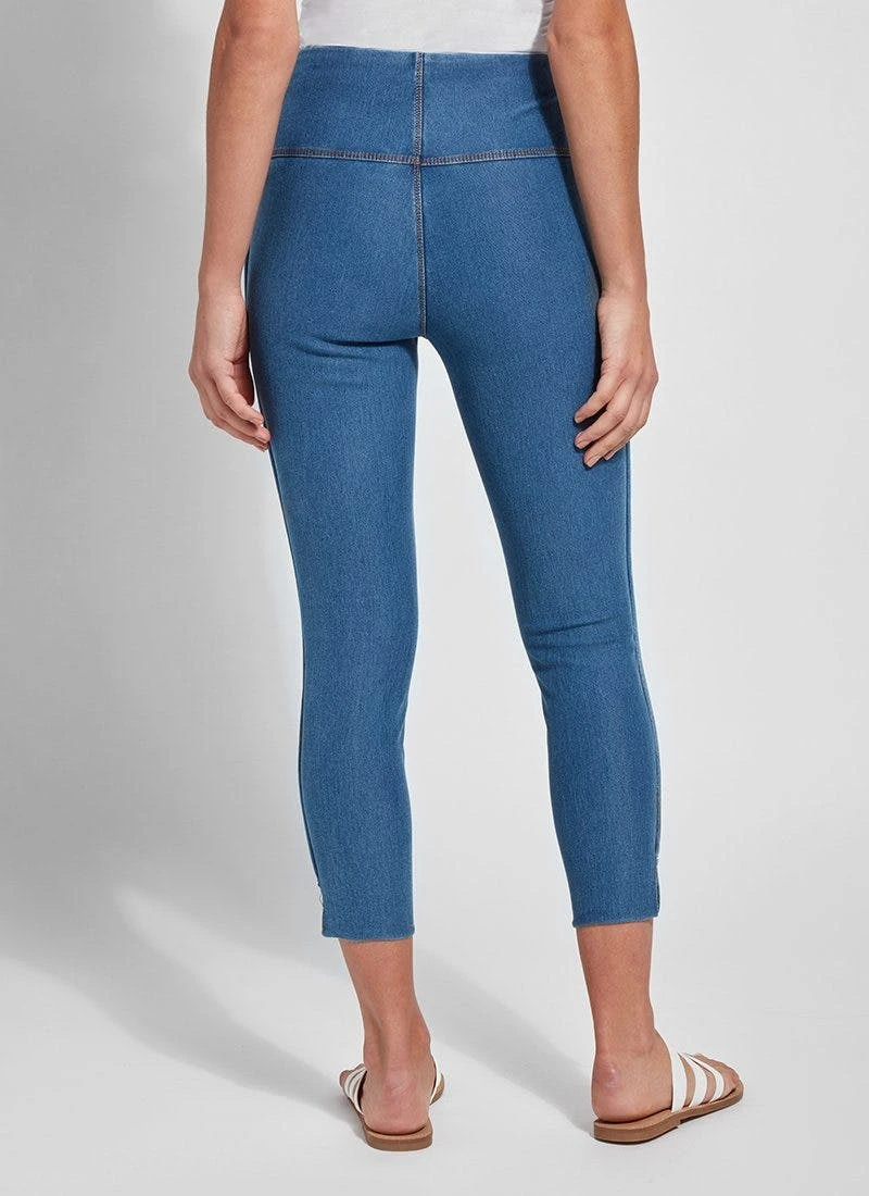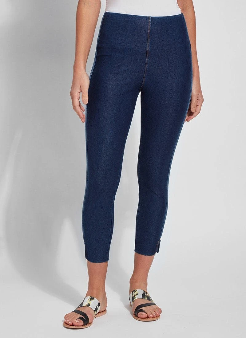 The cropped side slit denim is an ankle-length legging fashioned from eco-friendly repreve knit denim. While repreve denim feels and acts like regular knit denim, it’s created from recycled plastic bottles and takes on an elevated sheen. The cropped side slit denim partners beautifully with flowy tunics and sandals. Quality details include lyssé’s concealed patented waistband, tobacco topstitching and mini ankle slits.Repreve is an eco-friendly fiber made with recycled plastic bottles that offers moisture wicking, adaptive warming and cooling, water repellency and reliable, durable quality. It’s made by crushing recycled bottles, weaving them into fibers, then spinning them into fabrics. The eco-friendly repreve fibers create the polyester that makes up 18 percent of our repreve knit denim fabric. The repreve knit denim feels and acts like regular knit denim, except it takes on a slight sheen, and for that reason, creates a somewhat more elevated look. Each pair of lyssé repreve knit denim pants is made by recycling eight to 10 large plastic bottles.