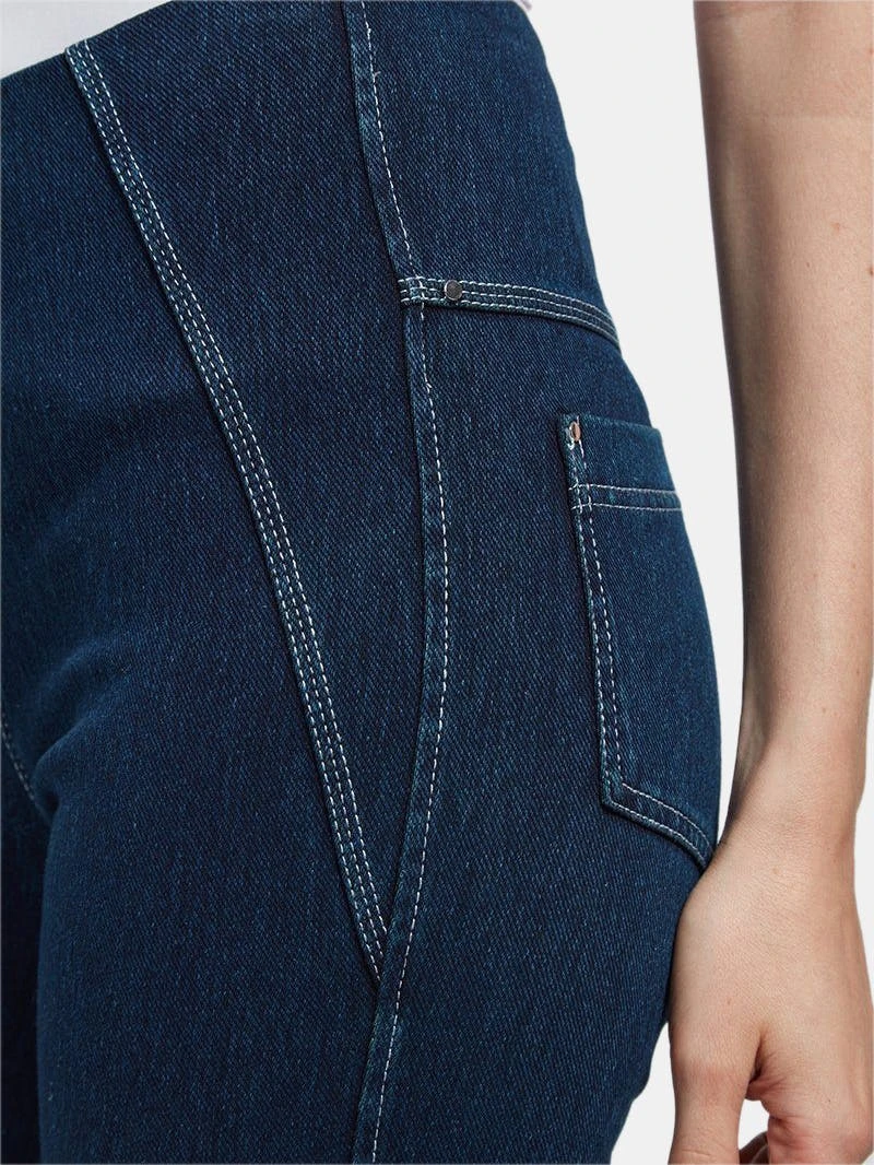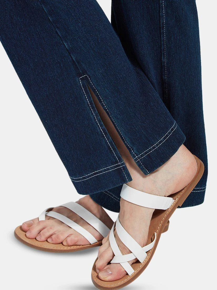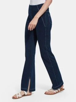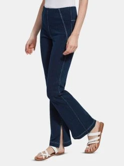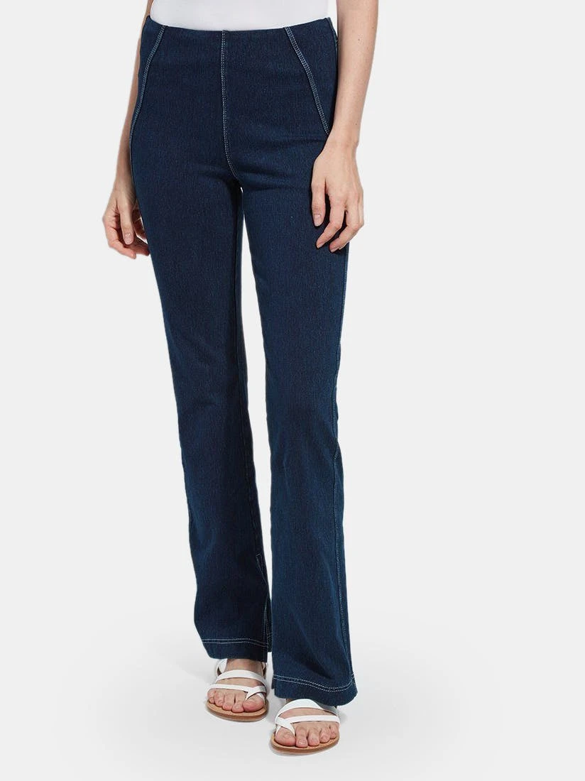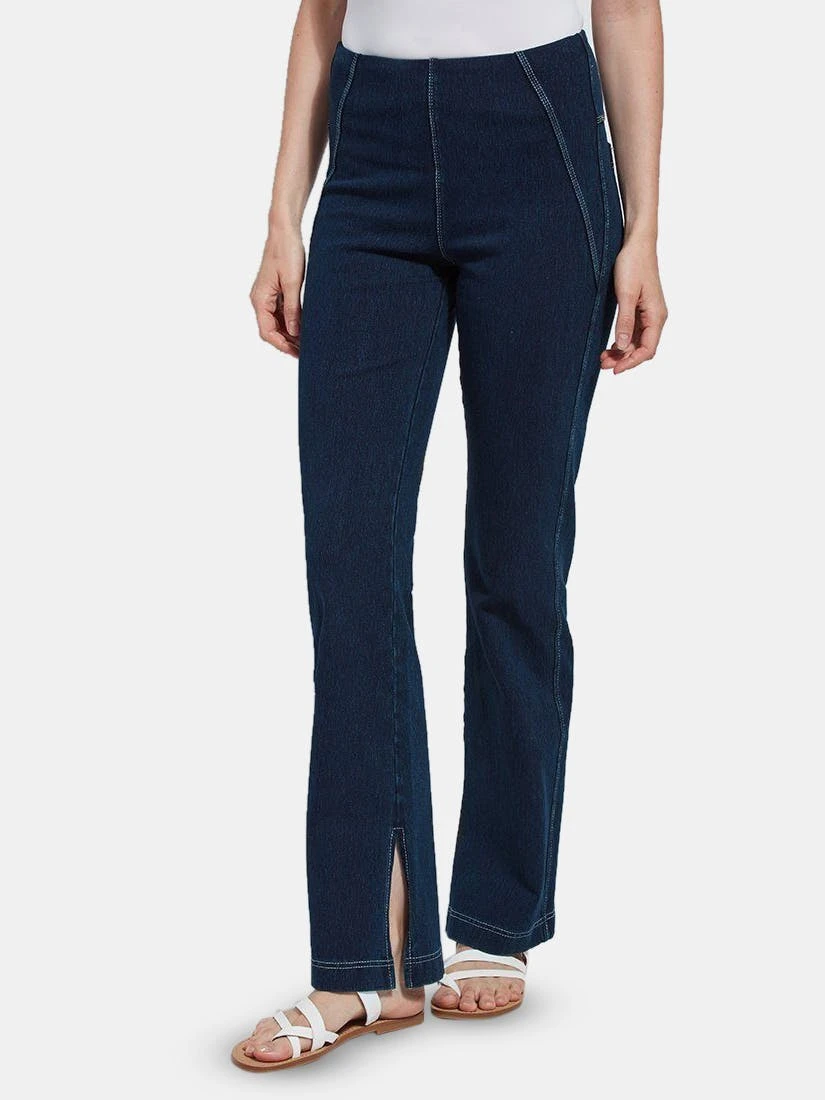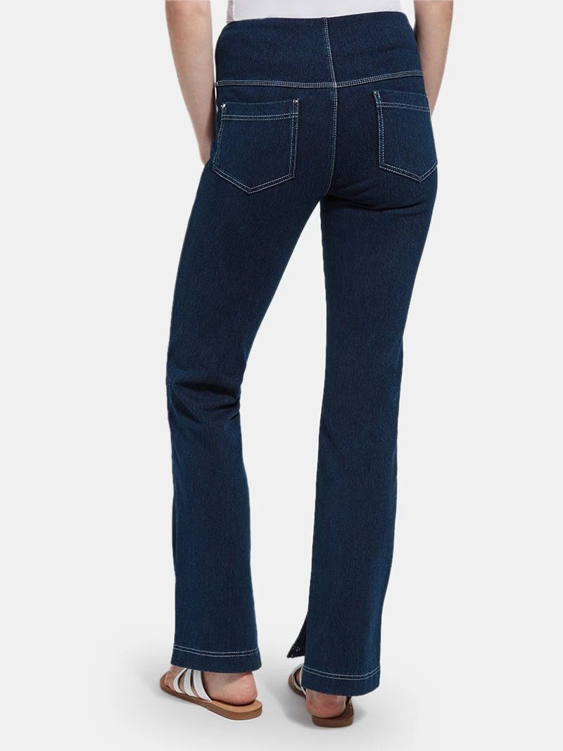 Crafted from stretchy Knit Denim, the Baby Bootcut Fashion touts pull-on styling, concealed patented waistband and contrast-color top stitching. Rich in detail with studded back pockets, deep side pockets, and anatomical seaming, they skim the hips and thighs before falling into an open bootcut hem. Cherish them for work or play with an ivory mock-neck top, black booties and vegan leather jacket.