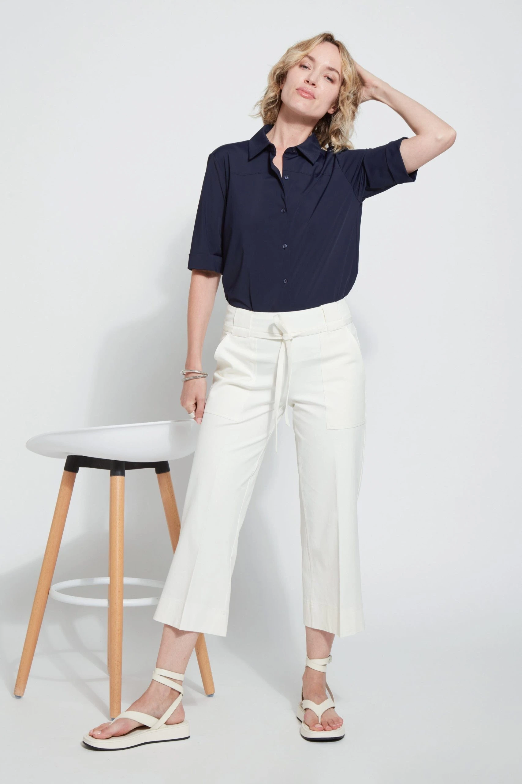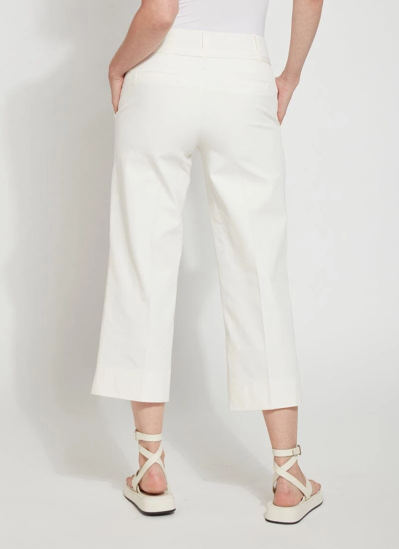 The Hallie ST Twill Wide Leg Crop is a pull-on, relaxed fit pant with a concealed patented waistband, front patch pockets, belt loops, off white topstitching, back welt pockets and a detachable, self-tie belt. Made from stretch twill, these wide-leg crops feature beautiful detailing, including a wide hem with side slits. Pull them on with the leah short sleeve top, in magnolia.