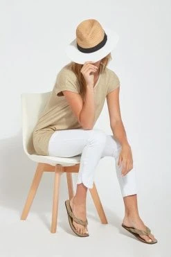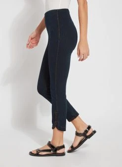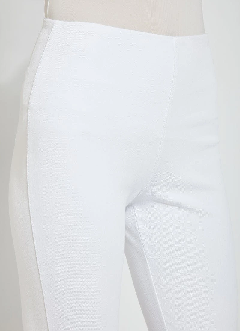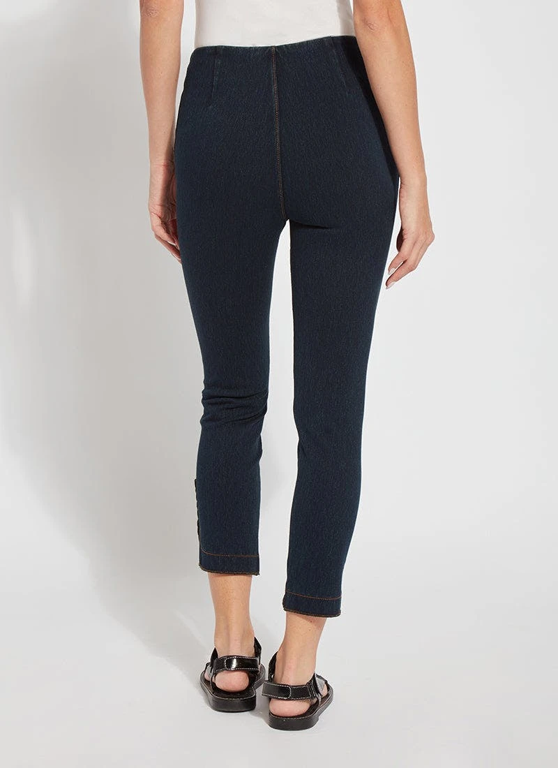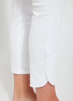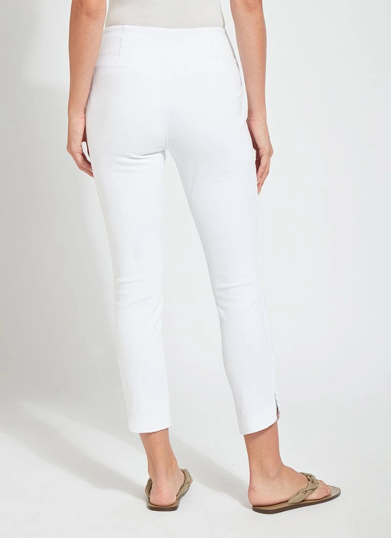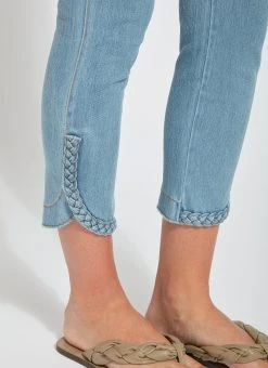 The new happy hour braided crop, in 4-way stretch knit denim, showcases a concealed patented waistband and a raw-edge, scalloped hem with hand-braided detailing. Available in several shades, the happy hour braided crop is fitted through the waist, hips and thighs before falling into a straight, cropped leg. Showcase the happy hour braided crop with our classic top and a lightweight cardigan for cool evening cookouts with friends.