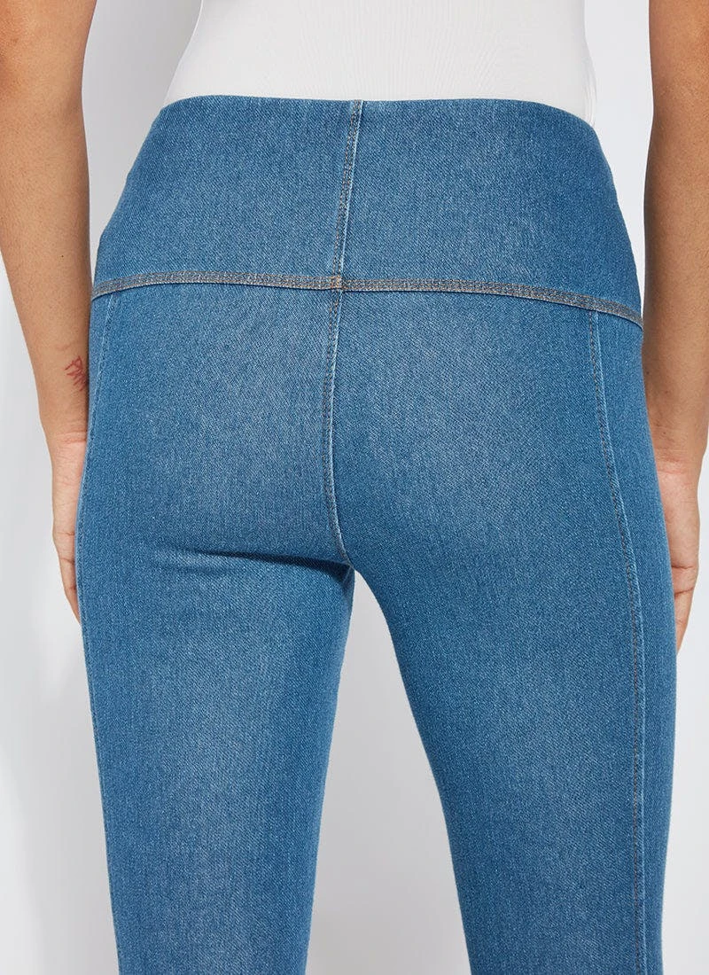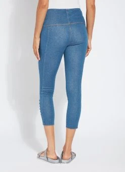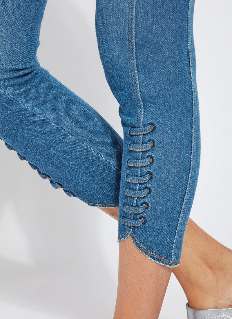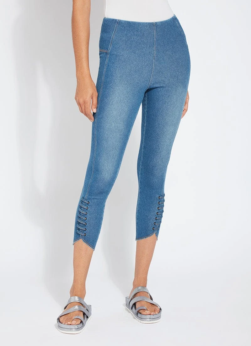 Our new, body-hugging lace-up hem crop delivers a flattering, slimming silhouette thanks to a concealed patented waistband, back yoke and anatomical side seaming. These cropped leggings, crafted of 4x-stretch knit denim, showcase a tulip-shaped, raw-edge hem with lace-up detailing. Team them with the ivory amalfi top, pointy beige slides and coordinating bucket hat.