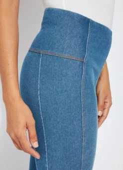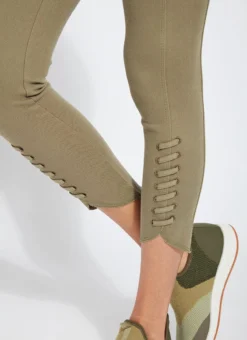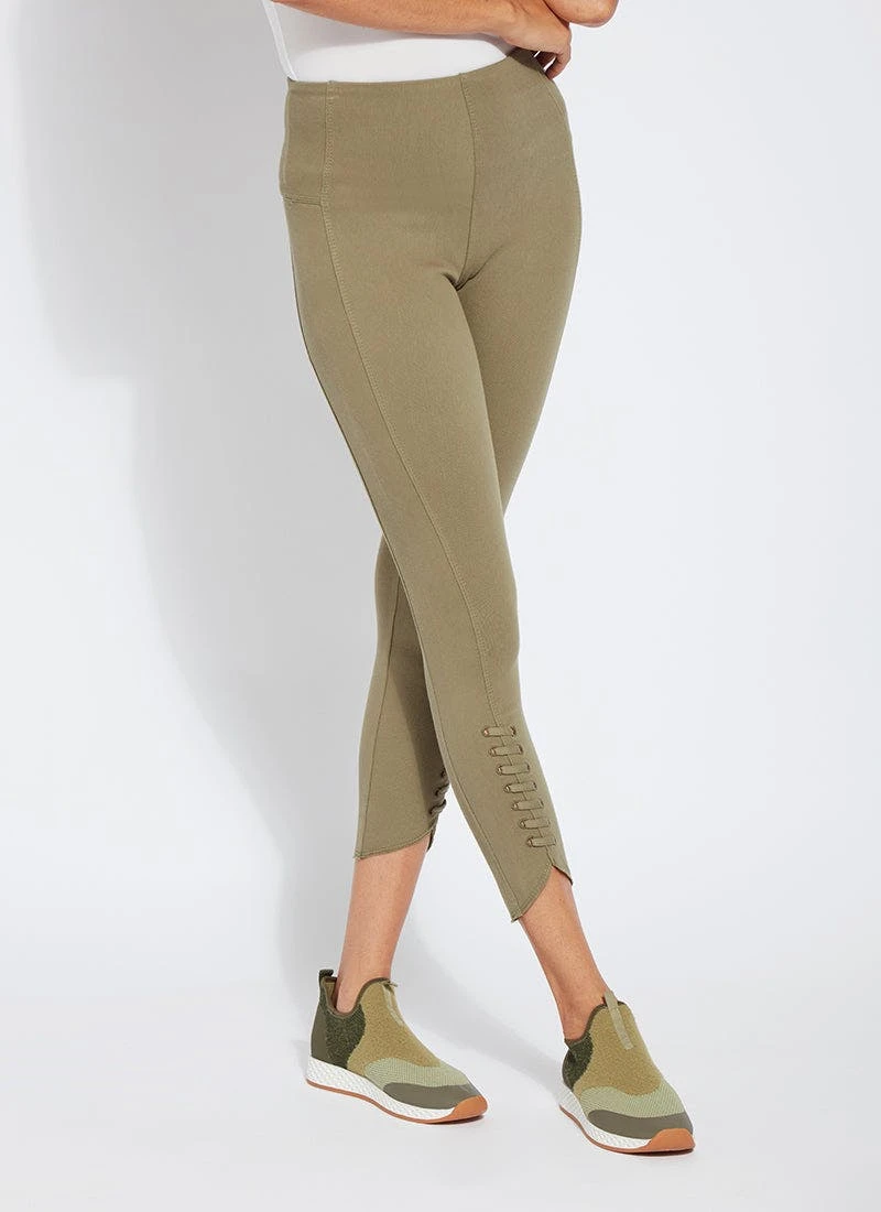 Our new, body-hugging lace-up hem crop delivers a flattering, slimming silhouette thanks to a concealed patented waistband, back yoke and anatomical side seaming. These cropped leggings, crafted of 4x-stretch knit denim, showcase a tulip-shaped, raw-edge hem with lace-up detailing. Team them with the ivory amalfi top, pointy beige slides and coordinating bucket hat.