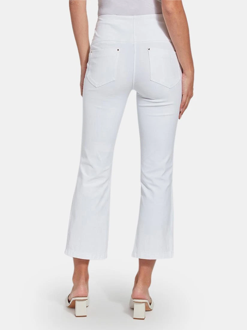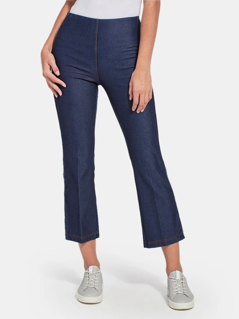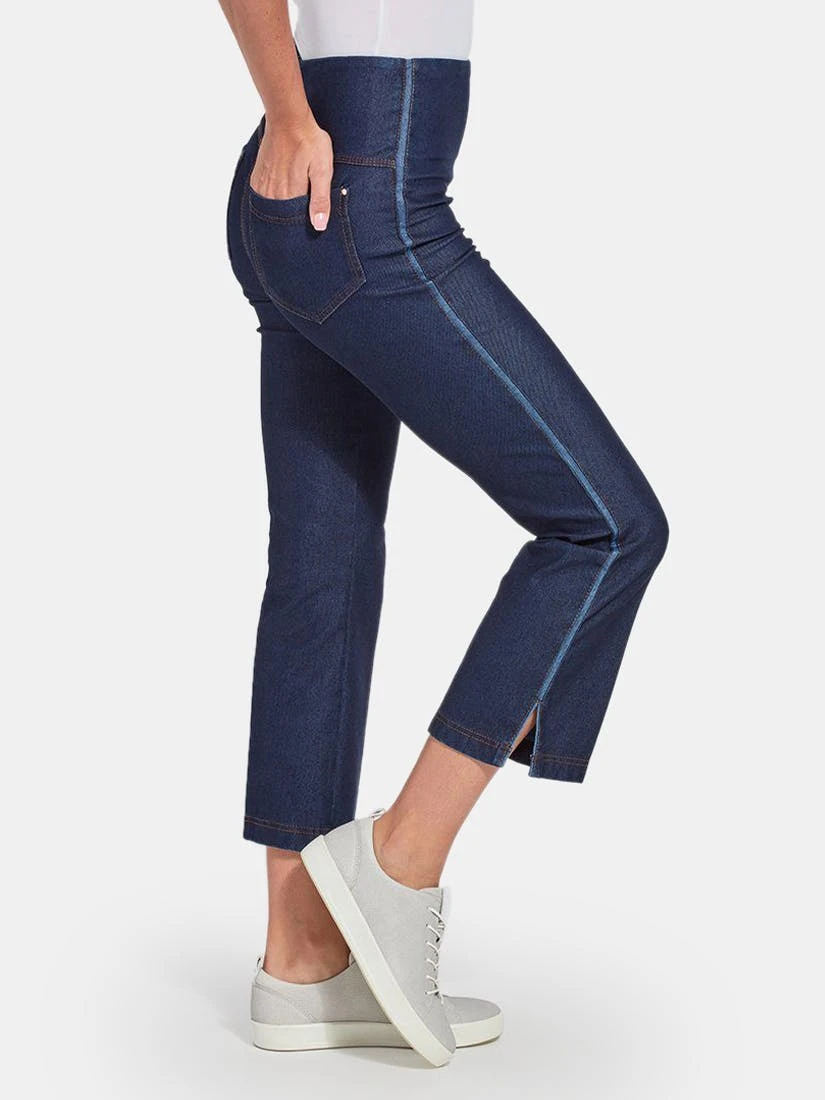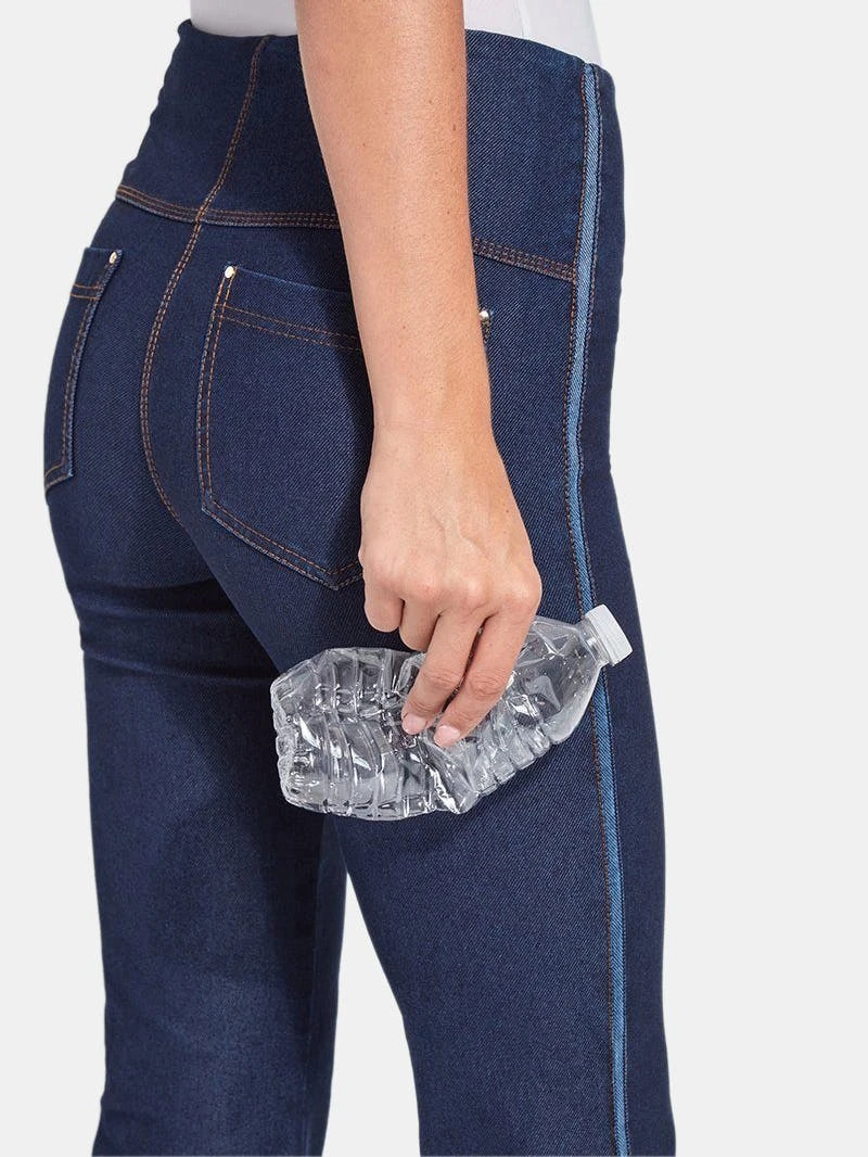 Crafted from eco-friendly Repreve® Knit Denim, these sporty bootcut crops are richly detailed with reverse fabric side inserts, ankle slits, tobacco topstitching and back patch pockets with light gold metal grommets. Featuring a concealed patented waistband and 4x-stretch comfort, the Nala Crop partners perfectly with our Eco Satin Shirt and sneakers.