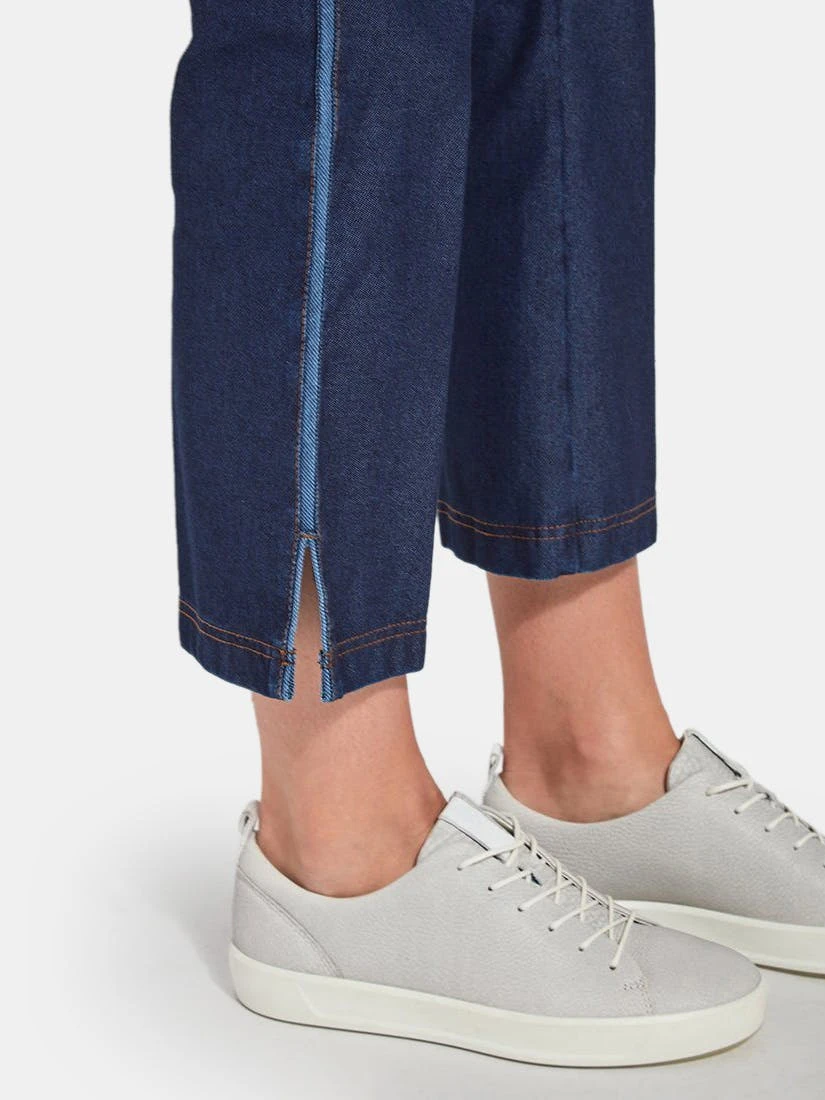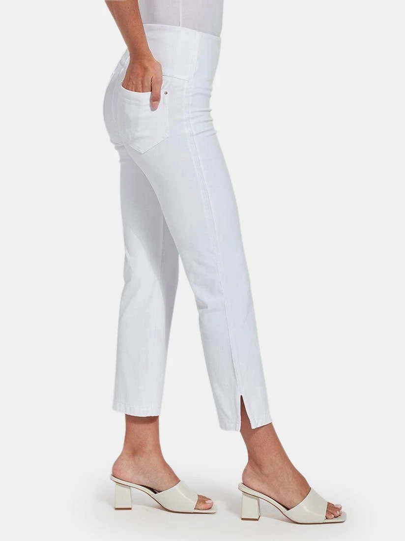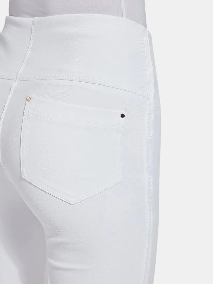 Crafted from eco-friendly Repreve® Knit Denim, these sporty bootcut crops are richly detailed with reverse fabric side inserts, ankle slits, tobacco topstitching and back patch pockets with light gold metal grommets. Featuring a concealed patented waistband and 4x-stretch comfort, the Nala Crop partners perfectly with our Eco Satin Shirt and sneakers.