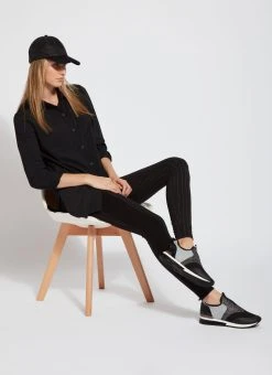 Showcase these urban-inspired ponte jacquard leggings for everything from errand running to enjoying coffee with friends. The timeless striped laura legging pattern, in black slub, features a concealed patented waistband that smooths and shapes; body-hugging comfort for all-day wear and anatomical seaming for rear contouring and lift. Side stripe detailing adds to their elevated, yet athletic feel. Created using a tightly woven ponte jacquard, these work or leisure leggings feel snugger than a ponte version, so size up if you’re between sizes. Sport them with the white eco satin shirt, faux suede bomber jacket and heeled ankle boots.
