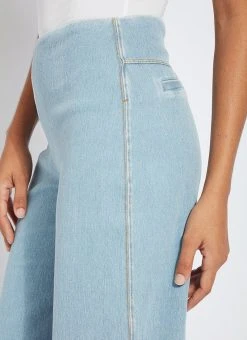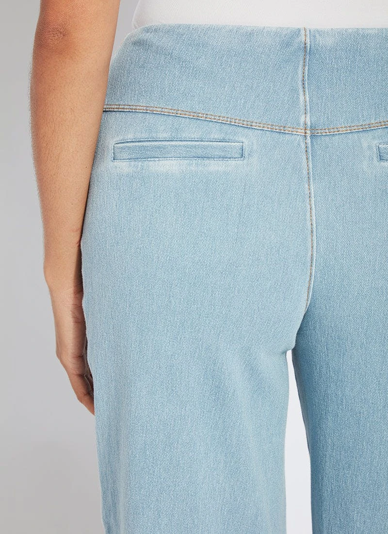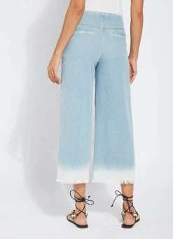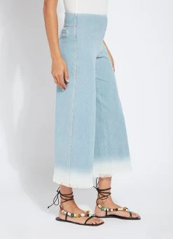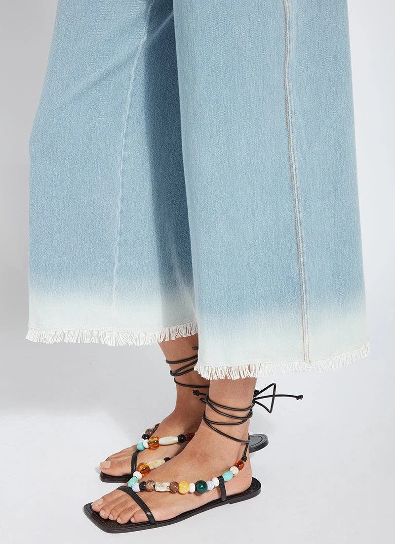 Laidback and so easy to wear, slightly cropped summer palazzo pants are foundational bottoms that partner well with fitted tees and tucked blouses. Featuring on-trend fringed hem, the summer palazzo offers a cropped wide leg, angled back yoke, back welt pockets, and flattering concealed patented waistband. Crafted from stretchy lightweight knit denim, these wide-legged crops feature a dyed and bleached fringe hem so each pair is one-of-a-kind.
