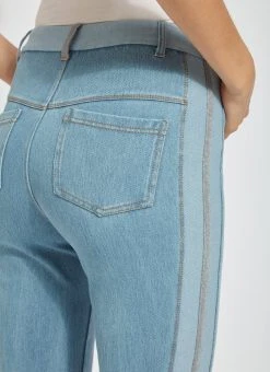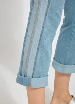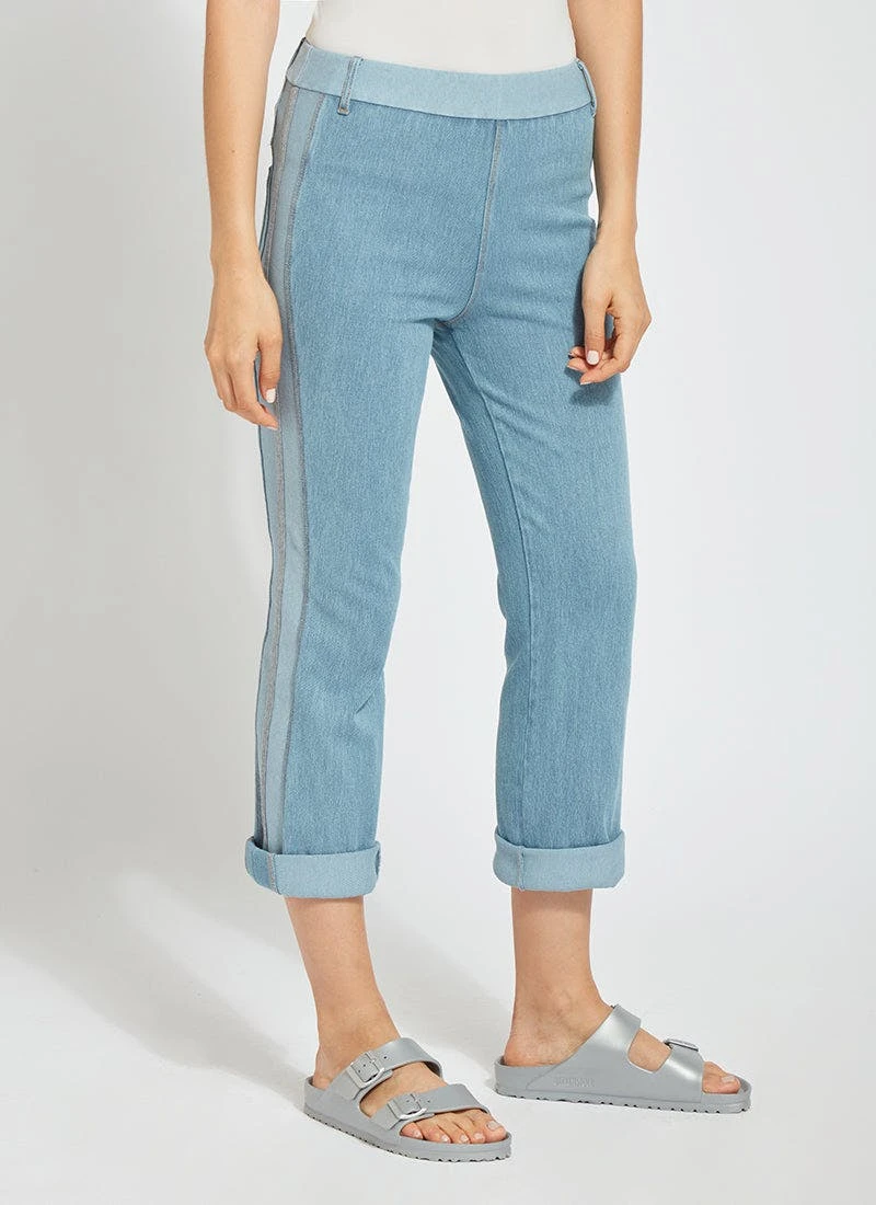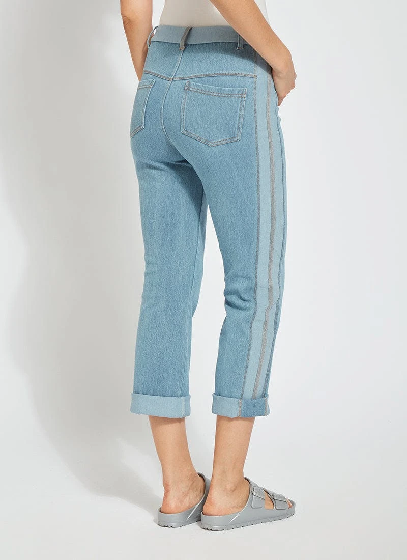 The tania cropped boyfriend jeans, crafted from 4x-stretch knit denim, skim the hips and thighs before falling into a straight, cropped leg. Featuring a concealed patented waistband, beltloops and back patch pockets, these boyfriend jeans partner perfectly cuffed or uncuffed with our airy classic top and pointy, nude slides. We especially love the two-color leg stripes with center stripe of grey mélange grosgrain tape.